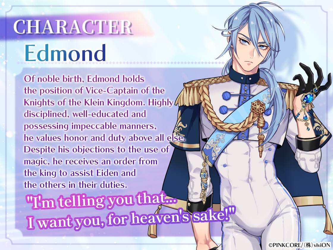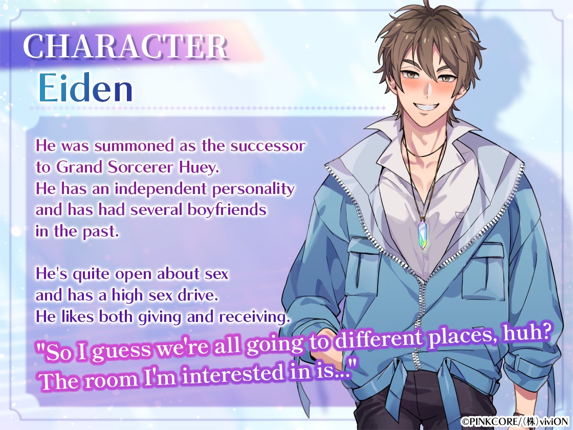 The protagonist, Eiden, summoned from another world as the successor to the Grand Sorcerer Huey,
