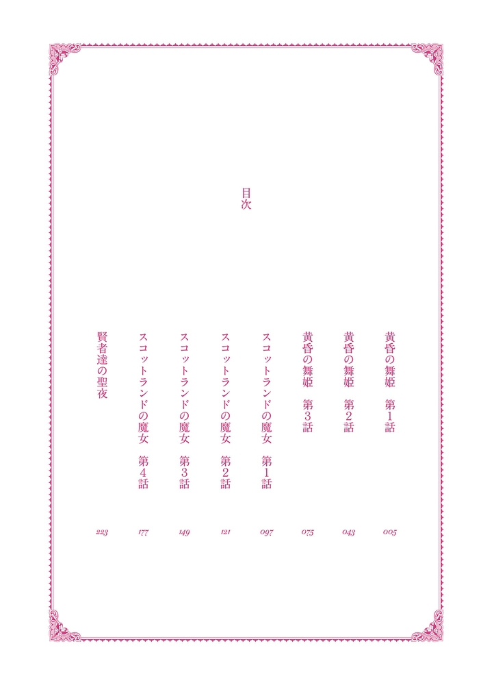 表題作シリーズの『黄昏の舞姫』『スコットランドの魔女』ほか、描きおろしも収録。