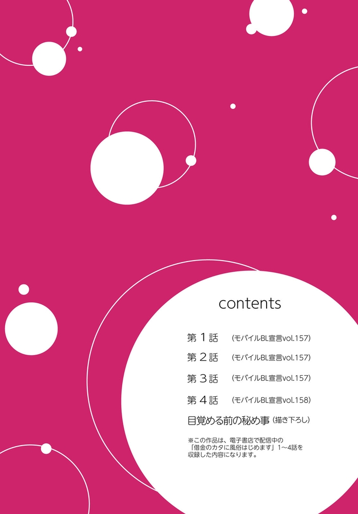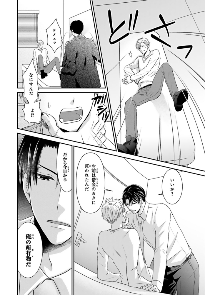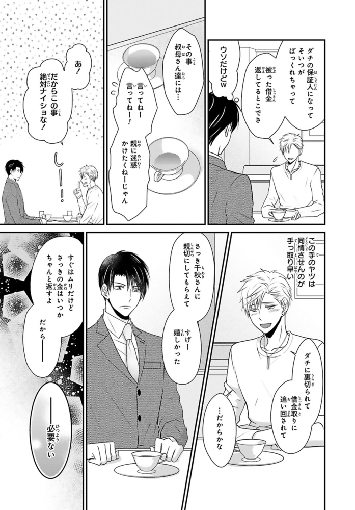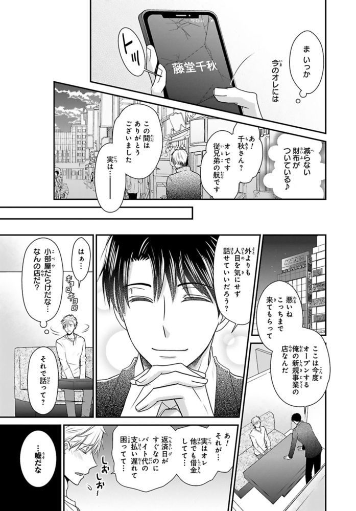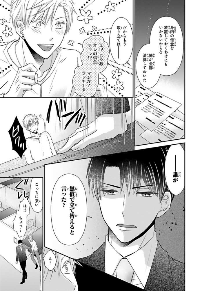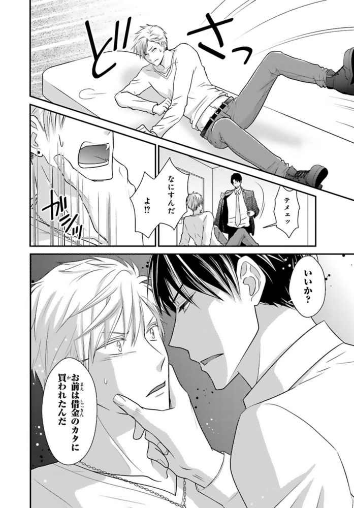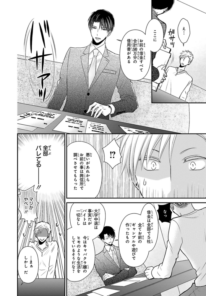 【電子書店限定、描き下ろしマンガ1P収録】ギャンブルで500万円の借金を抱える無職ヒモ男の航。取立屋に恫喝されている所に偶然会社経営者の従兄弟・千秋と出くわすと、借金を全額返済してくれて…?これに味を占めた航は更に金を巻き上げようと画策するが、千秋の態度が一気に豹変。「誰が無償で立て替えると言った?」肩代わりしてもらった分のお金を返すべく、千秋が経営するマッサージ風俗店で働くことに!?乗り気じゃないと思いつつ始めた航だったけど、研修で明らかになった千秋の凄腕テクに翻弄されまくる――!※こちらは話売り『借金のカタに風俗はじめます』1~4話を収録した単行本です。重複購入にご注意ください。
