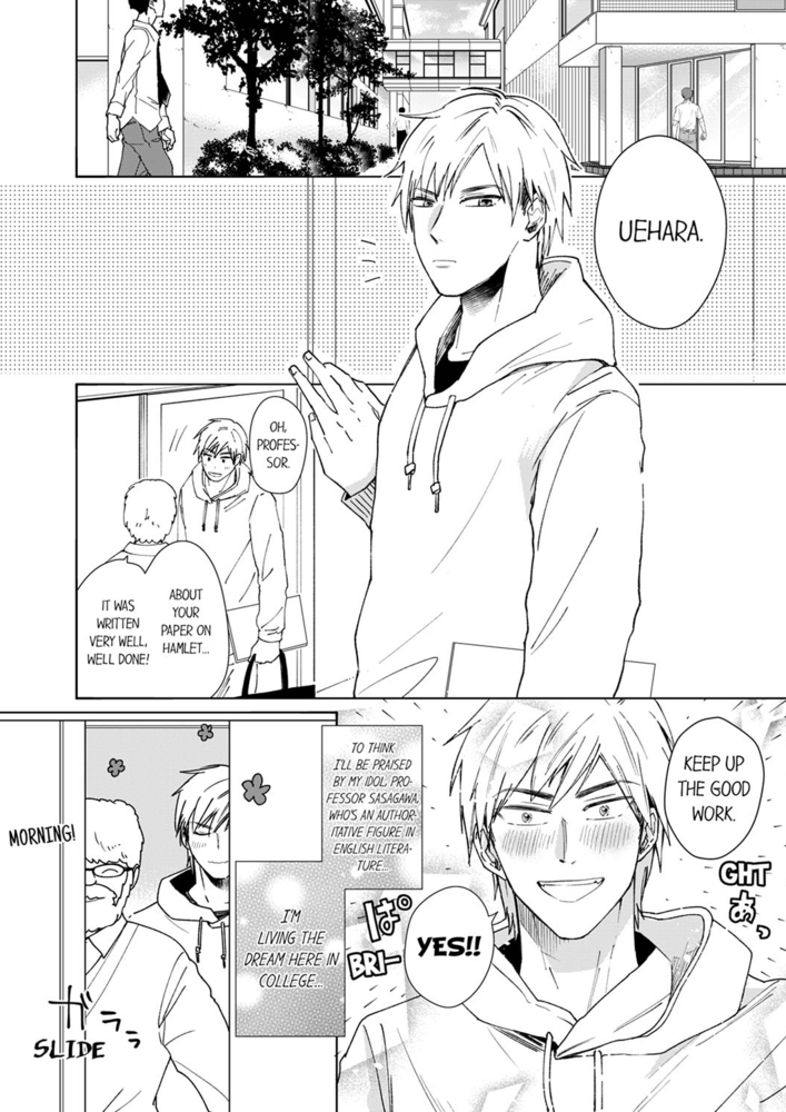 “Mn! Don’t stop…! Uehara…!” - The Professor thinks highly of him, and he has a good relationship with his girlfriend! Uehara is enjoying his university life everyday, but whenever he sees Izumino, who’s in the same seminar as him, all they do is argue. One day, Uehara was suddenly dumped by his girlfriend…!? He goes to drink his sorrows away and sees Izumino who has also been dumped!! On top of that, Izumino riles Uehara up by suggesting that he must have been dumped because he sucks at sex…!! Uehara, wanting to prove that Izumino is wrong, ends up having sex with him…!? This is another exciting romantic comedy by konno!