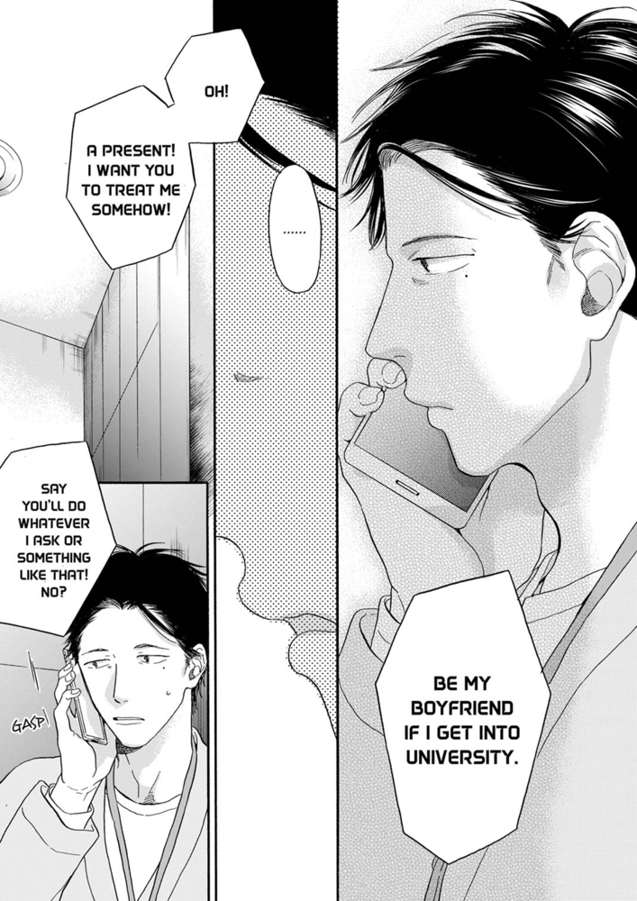 “I love seeing that troubled look on your face.” One night, cram school teacher Akitomo grows worried about a young man who has come into his favorite gay bar for the first time and sit down for a drink with him. He’s then suddenly asked to go to a love hotel...!? Fucked deep many times on the bed there, he spends all night long cumming his brains out. Their bodies fit perfectly together! But the guy is so young... so Akitomo figures it will just be a one night stand. However, the new student who shows up at his work place happens to be the very same Yoh he had just slept with the night before...!?