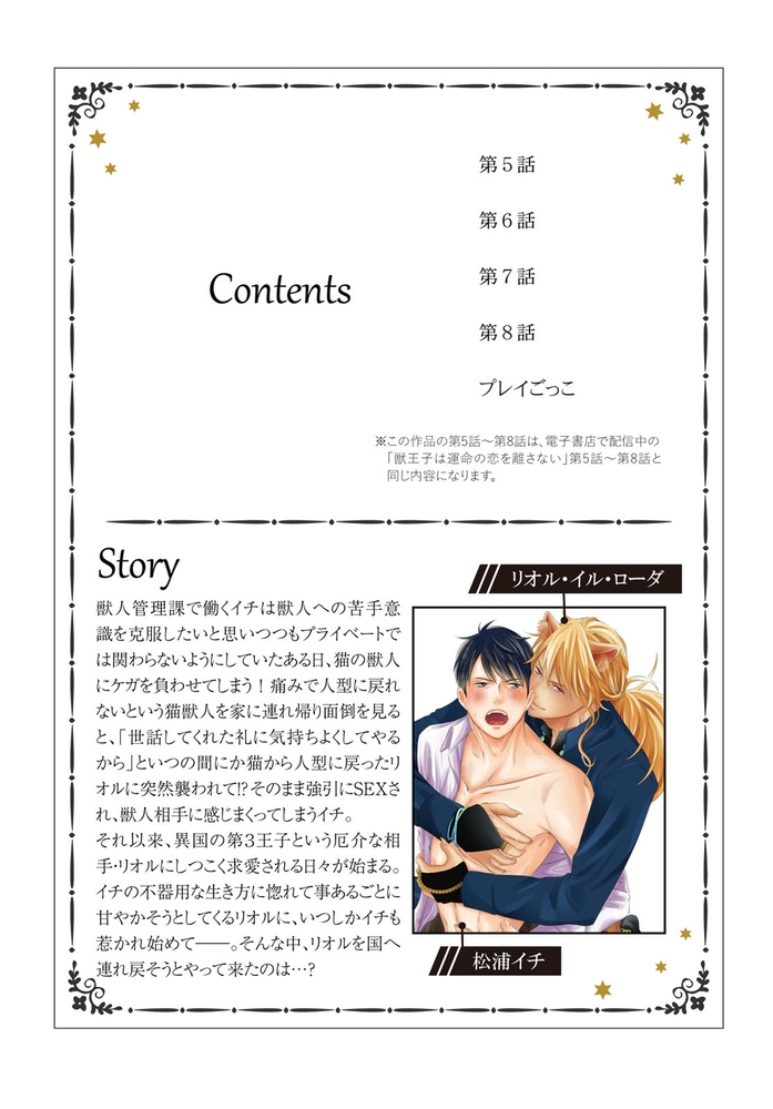 【電子書店限定、描き下ろしイラスト1P収録】獣人が苦手だったのに、猫獣人の王子・リオルの求愛を受け入れ始めたイチ。ベッドの上で恋人のような激しい蜜月を過ごしていると、そこへ突然乱入してきたのはリオルの弟王子・ユノで…!?「国に戻って子供をつくれ」とリオルに告げ、帰国を迫るユノ。大きな義務を背負うリオルに、その存在を失うかもしれないと気づいたイチは――?スパダリ猫王子×コンプレックス持ち庶民のロイヤル異種間BL、感動の完結巻!甘々な描き下ろしHも収録。※同タイトルの5話~8話を収録した単行本版です。重複購入にご注意ください。