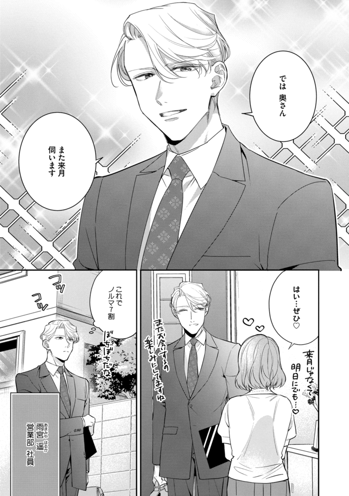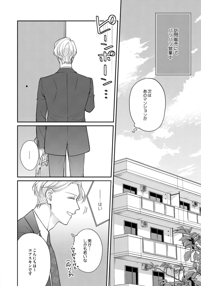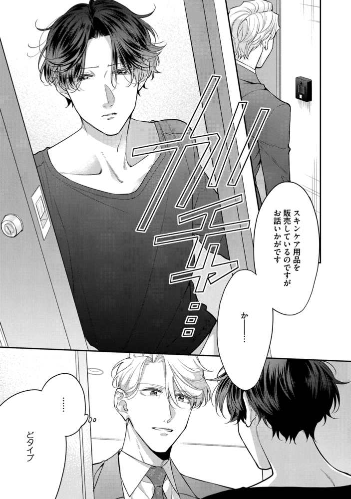 スキンケア用品の訪問販売でトップセールスを誇る遥と、個人サロンを営むセラピストの直樹。 ふたりの出会いは、勘違いのキスから始まった――? 客と間違えてキスを迫ってしまった直樹に、さらに深く口付けを返す遥。そんな遥の笑顔と強引さに絡め取られた直樹は、遥の商品を「実演付き」マッサージで体験することになって!? 快楽に弱い直樹は、遥の巧みな手つきで快感を煽られ、お尻まで気持ちよくなってしまい――…。