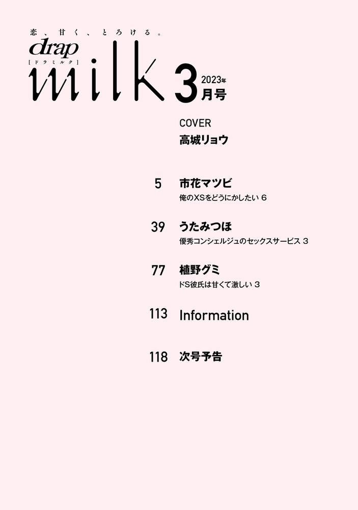 drap milkはオール描き下ろし! オトナの溺愛系BLマガジン とろあまHから過激ラブまで★ 毎月15日に新作更新中! 市花マツビ「俺のXSをどうにかしたい 6」──「男に告白なんて、初めてだしわかんねーよ」── 人気ファッションモデル・朋には誰にも言えない秘密がある。それは《アソコが小さい》こと…! そんなXSサイズにコンプレックスを持つ朋の秘密が、同僚モデル・成にバレてしまった! しかも、成は巨根の持ち主で!? 秘密を共有した二人は、前立腺を刺激させてアソコを大きくする練習をすることに。そんな朋は成への恋心を自覚し、告白しようとするけれど……? 正反対な二人の《チントレ》から始まるハッピー・ラブストーリー! 遂に大団円の最終話★ うたみつほ「優秀コンシェルジュのセックスサービス 3」──「今までしたどんなセックスよりも良かった…このセックスに溺れたら大変なことになる」── NYに本社を構える高級ホテル「スターチス」グループ。そのトップでオーナーのライは、「スターチス 東京」に《お客様の要望はどんなことも断らない》と言う超優秀なチーフコンシェルジュ・真宮の存在を知る。俄然興味が湧いたライはさっそく日本へ飛び、己の身分を隠して、真宮に無理難題やセックスを要求。すると、極上のセックスサービスが提供されて──?? そんな真宮の、ライに対する気持ちが見えてくる!? 真宮視点の第3話掲載! 植野グミ「ドS彼氏は甘くて激しい 3」──「どんどん勃ちやすくなってる。認めろよ、俺がフェラ上達してるって…!」── 男性向け風俗で働くツカサは、《フェラ一本》で稼ぐ、超効率至上主義! そんなツカサは、客と間違えて店内AV撮影をしていた俺様系ドSの有吾に手を出してしまう。自慢のフェラでイカせようとするも「生意気な表情は悪くない、俺が特別に教えてやるよ」と、ドSなレクチャーにトロトロにされて!? その後も指名してくる有吾だったが、頻度が減ったことに焦燥感を感じるツカサは、とある誘いを持ち出して──…! 今月号は、高城リョウ先生の大人気コミックス「喰われるほどに暴かれて」より、天鷲&廉士のアダルトな描き下ろしイラストが目印★ dCDX「喰われるほどに暴かれて」は大好評配信中!! (高城リョウ先生は表紙のみの掲載です)