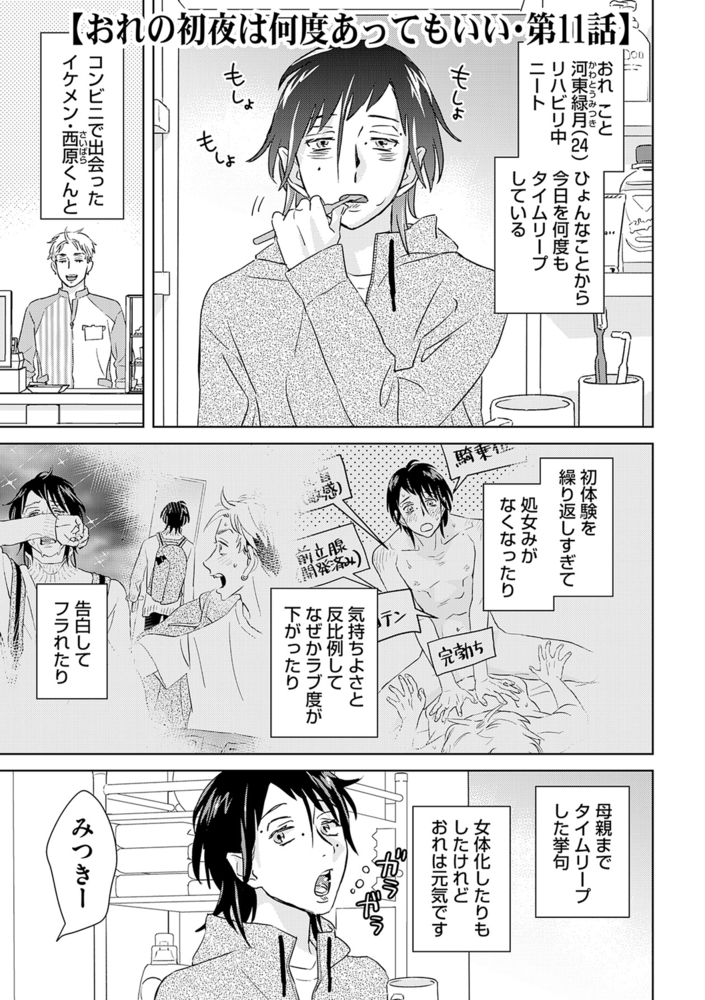 アナニー好きで引きこもりニートな河東緑月。ゲイの自覚はあるものの、その圧倒的コミュ障力により未だ経験なし。マッチングアプリに活路を見出そうとするも、待ち合わせ相手にビビって身を隠してしまうヘタレっぷりを発揮。最寄りのコンビニであからさまにキョドっていると、イケメン店員の西原が助け舟を出す。「経験したいなら俺とかどう?」 斯くしてヒキニートの初体験は実現することになるのだが!!? 新鋭・今井ささるによるタイムリープエロス。毎月第4土曜に続話が追加されていきます。