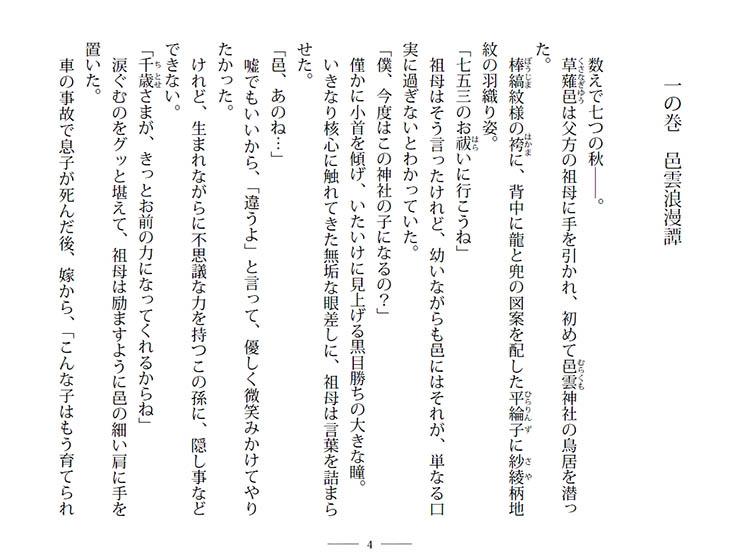 連れてこられた神社の裏手に広がる池で、邑は不思議な出来事に遭遇する。