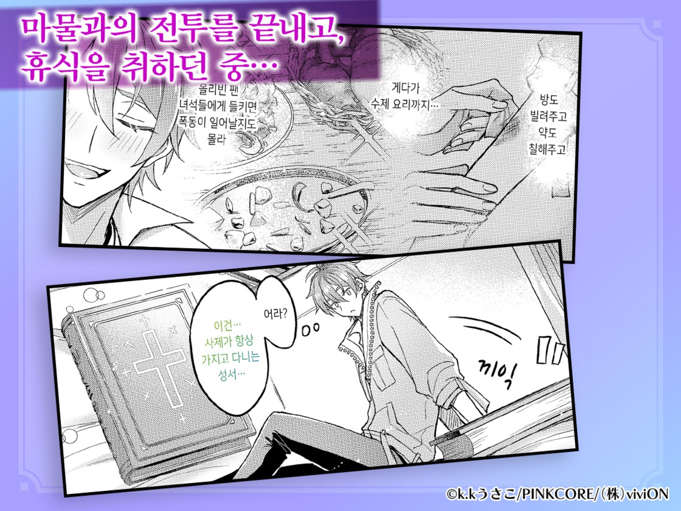 마물과의 전투를 끝내고 쉬고 있던 에이트는, 사제의 성서를 발견하게 된다.