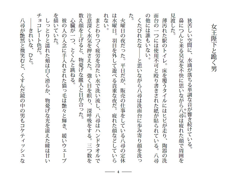 八尋はなじみのバーで「女王陛下」と呼ばれる程の美貌の持ち主だ。