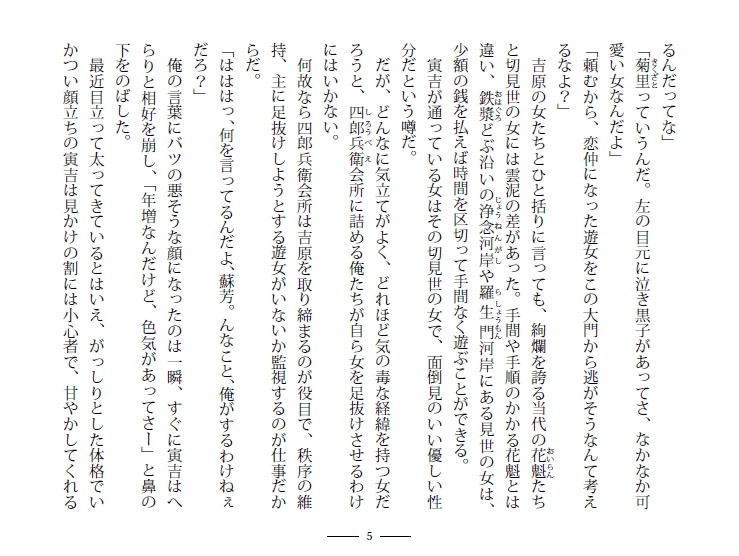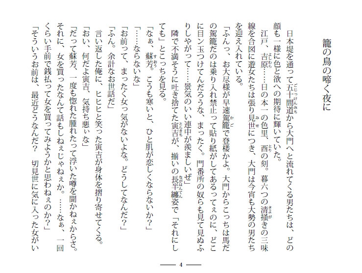 吉原の会所に詰める蘇芳は、ふとしたことから呉服問屋の若旦那である陣と知り合った。