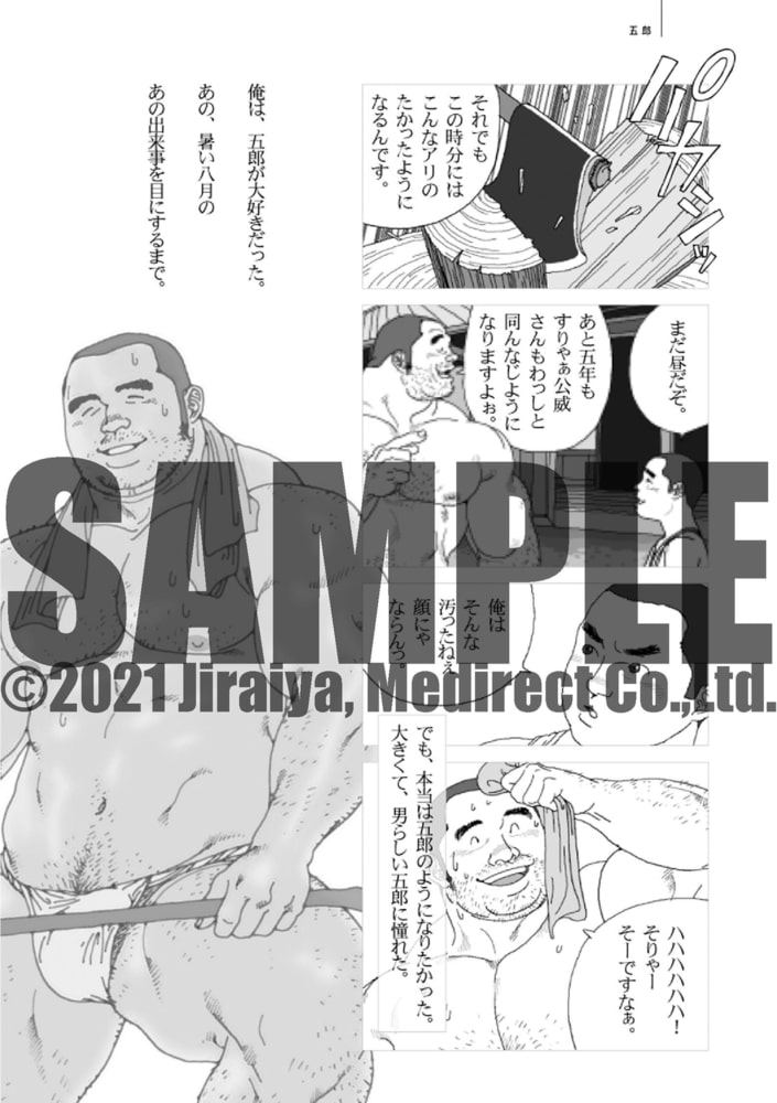 五郎の鈴先からは先走りが滴り落ちる。父親にサオを竹刀で責められ、五郎は射精してしまう。そして、その精液を潤滑油にして、父親は五郎の尻を犯し始めて…。父親からの一方的な責めかと思いきや、明らかに五郎は欲情していたのだ。