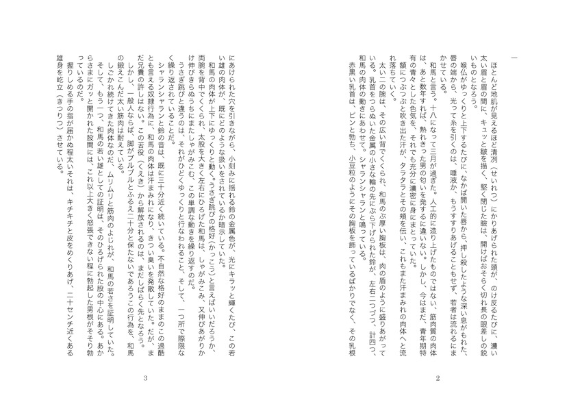 〜既に四日、風呂にも入れてもらえぬ和馬の肉体は、雄の脂っこい分泌液にヌルヌルとし、しとどにかいた汗の臭いと共に、獣じみた強烈な雄臭さにむせかえるほどだ。それが今、欲情した雄の臭いと混じりあい、蒸れきっていた。「まだいかせねぇよ。もう少し、てめえの肉体を遊んでからだぜ」兄貴は言う。「晒しものになった雄はな、晒しものらしく、皆にその肉体を見て頂かねばならねえんだぜ」「そうだ、見せろ!! 見せろ!!」和馬と同年代の若い声が、なかばからかうように続ける。〜本文より