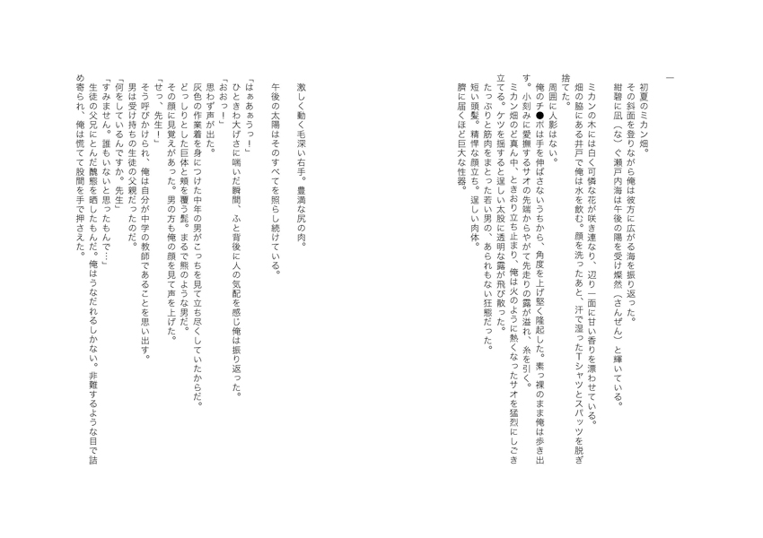 初夏のある日、白く可憐な花が咲き誇り、甘い香りが満ちるミカン畑の中で、教師は大胆な行動に出る。