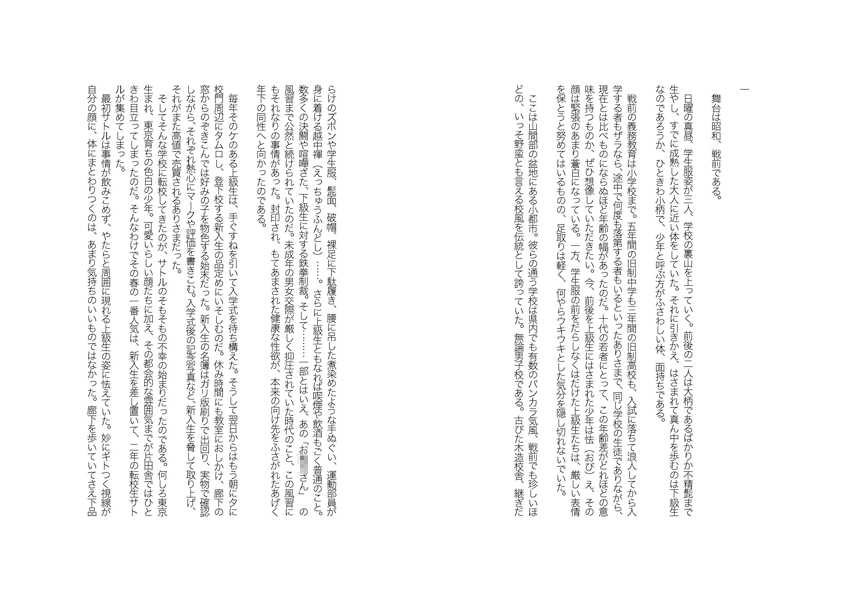 誰かの稚児として庇護を受けなければ、彼を狙う全ての上級生の餌食となるしかない。サトルに選択の余地は無かった。彼の保護者として筆頭に立ったのは、ムサくるしい風貌で大人にしか見えない、柔道部主将の木戸であった。