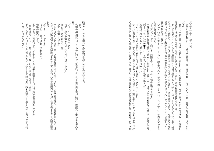 ある日、サトルは木戸を含む厳つい上級生たちに囲まれ、小山の草地へと連れ込まれる。そして、上級生の稚児となる口上を、自ら読み上げさせられるのだった。裸になって体を清められるサトル。強○浣腸の恥辱と苦痛に悶えた後は、股間剃毛を経て、本番の口上をもって儀式が始まった。