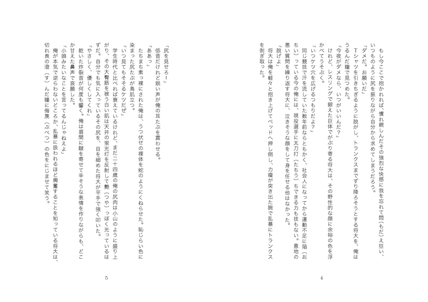 将大を受け入れ、そして組みしかれる俺。それが、色地獄への第一歩だった…。