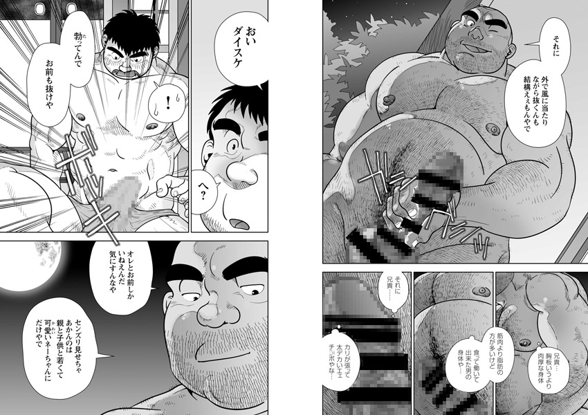 夕飯を食うやいなや、庭で全裸になって自慰をおっぱじめるタケオ。驚愕するダイスケに「一緒にやろうぜ」と誘ってくる。
