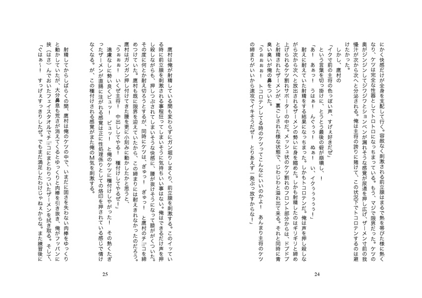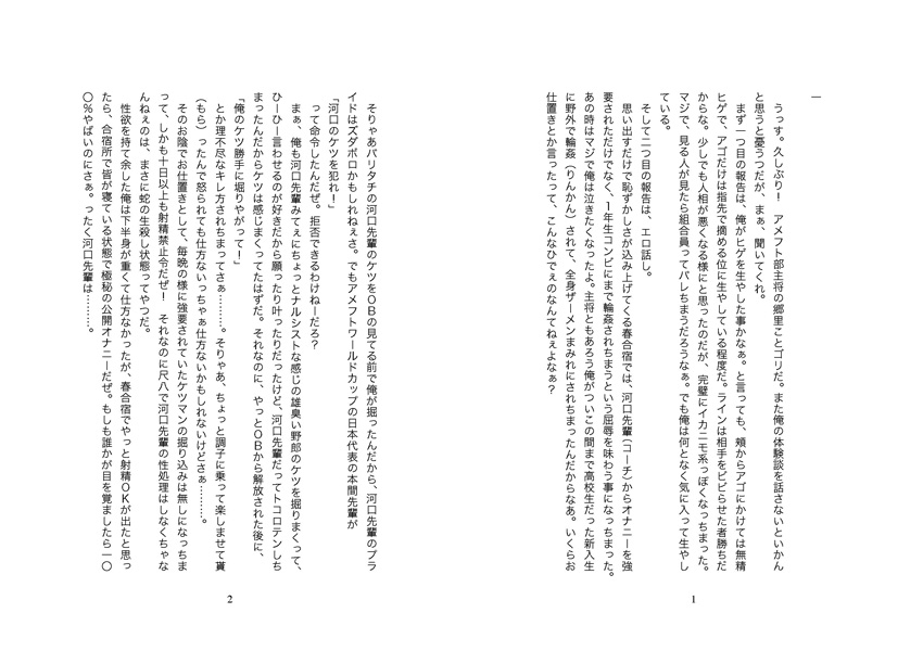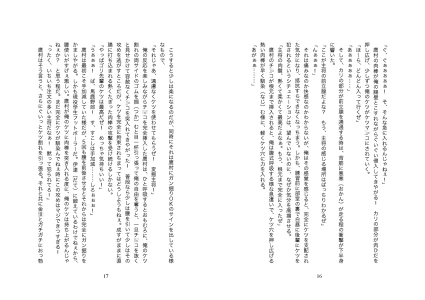 河口先輩の命令で、生意気な新一年生の熊川と鷹村の性処理道具として使われる毎日を送る、肉奴○主将・郷里。
