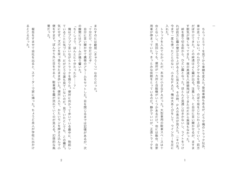 深い霧につつまれたパーキングエリア、運転席で自分の息子を慰める俺。