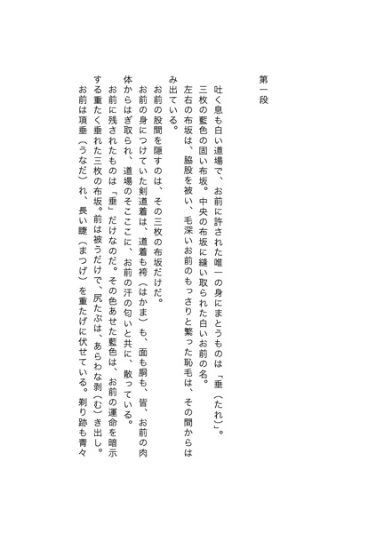 底冷えのする真冬の道場で、向き合う若者と年上の男。若者は剣胴着の「垂(たれ)」だけを身に付けており、尻は剥き出しであった。そして、盛り上がった胸筋と、引き締まった腹筋を露わにしている。