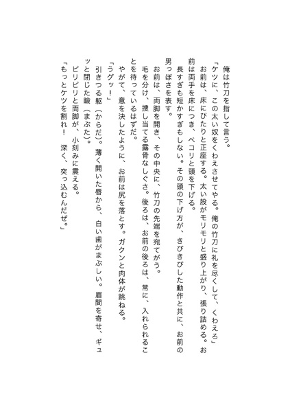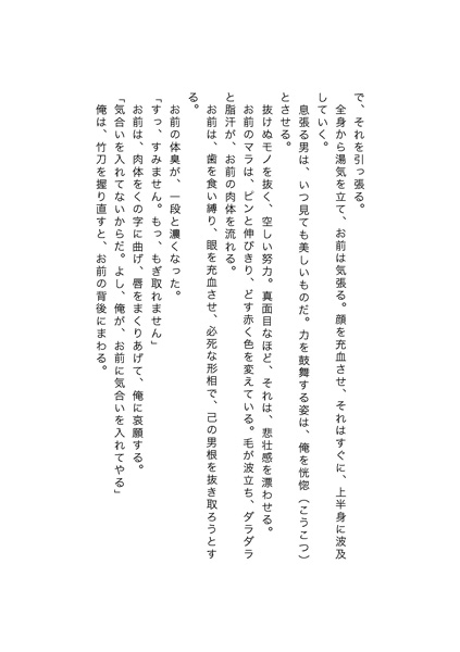 年上の男は若者の体と股間を、竹刀で責め嬲る。青年はそれに応えるように、逸物を堅くいきり勃たせて、それをまた男から責められ…。やがては、竹刀は青年の肛門へと深くねじ込まれていく。「もっとケツを割れ!! 深く、突っ込むんだぜ」「はっ、はい!!」