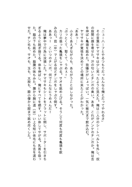 ャワー浴びてねぇから臭いっスよ」困った顔をするくせに、俺がさらに鼻を股間に近づけると、奴のサオがサポ