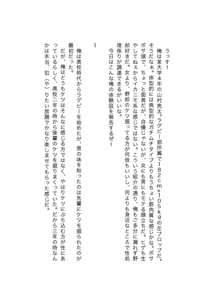 高校時代、ラグビー部の先輩からケツを掘られたことがきっかけで、男の味を知った山村。しかし、ケツを掘られるよりは、掘る方が性に合うらしく、高校時代は後輩のケツを掘りまくっていた。そして、大学に入り、ラグビー部の新入生歓迎会が、学生寮で開かれた夜のことであった。