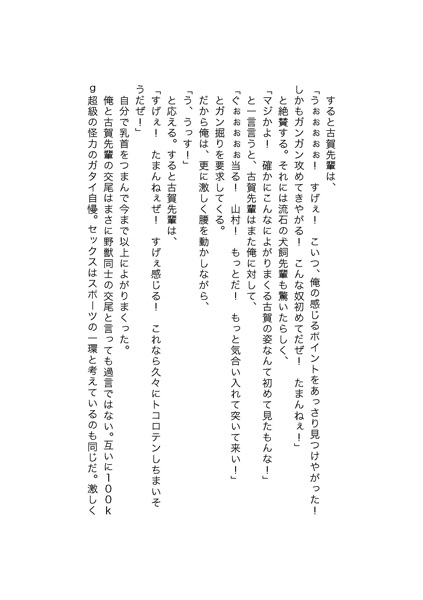 『「おいおい。こいつ、勃起しやがったぜ!」「マジかよ! こいつホモだったのかよ!」「やっぱりなぁ。なんか怪しいと思ってたんだよなぁ」「まさか期待の新人がホモだったとはなぁ。最悪だぜ」という鄙猥な言葉に、俺の節操のないチンコは完全勃起してしまった。(とうとう、バレちまった……)まさかとは思ったが、こんなところで勃起するとは自分自身信じられなかった。そして、俺はこの瞬間、全てが崩壊していくのを感じずにはいられなかった。俺は愕然としながらも、チンコは隆々と反り返ったままだ。俺はこの場から逃げ出したくて仕方なかったが、犬飼先輩が立ち上って俺に近付くと、いきなり勃起した俺のちんこをぎゅっと握った。そして一言、「お前、タチ、ウケどっなんだ?」と耳元で質問してきた。俺はその質問に正直に応えて良いものかどうかわからず、「そ、それは……」と言葉を濁す。すると犬飼先輩は、「どっちかと聞いているんだ!」と言って俺のチンコを力任せにしごき始めた。』(本文より)