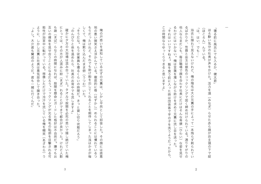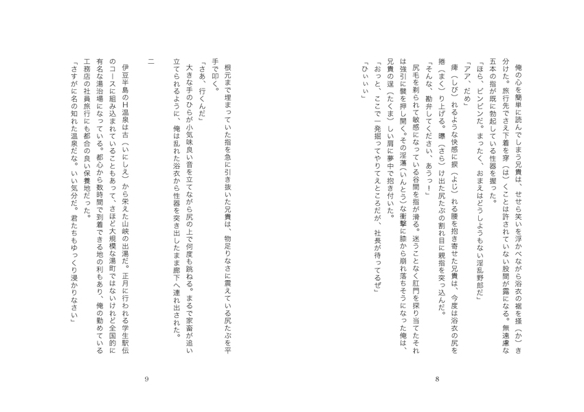 勤務先の社員旅行で、伊豆半島の温泉地を訪れた健太と大介。同行したのはノンケの同僚数人と、五十歳になる巨漢の社長であった。その夜、就寝前に風呂に入ろうと社長に誘われ、健太と大介は大浴場に向かう。