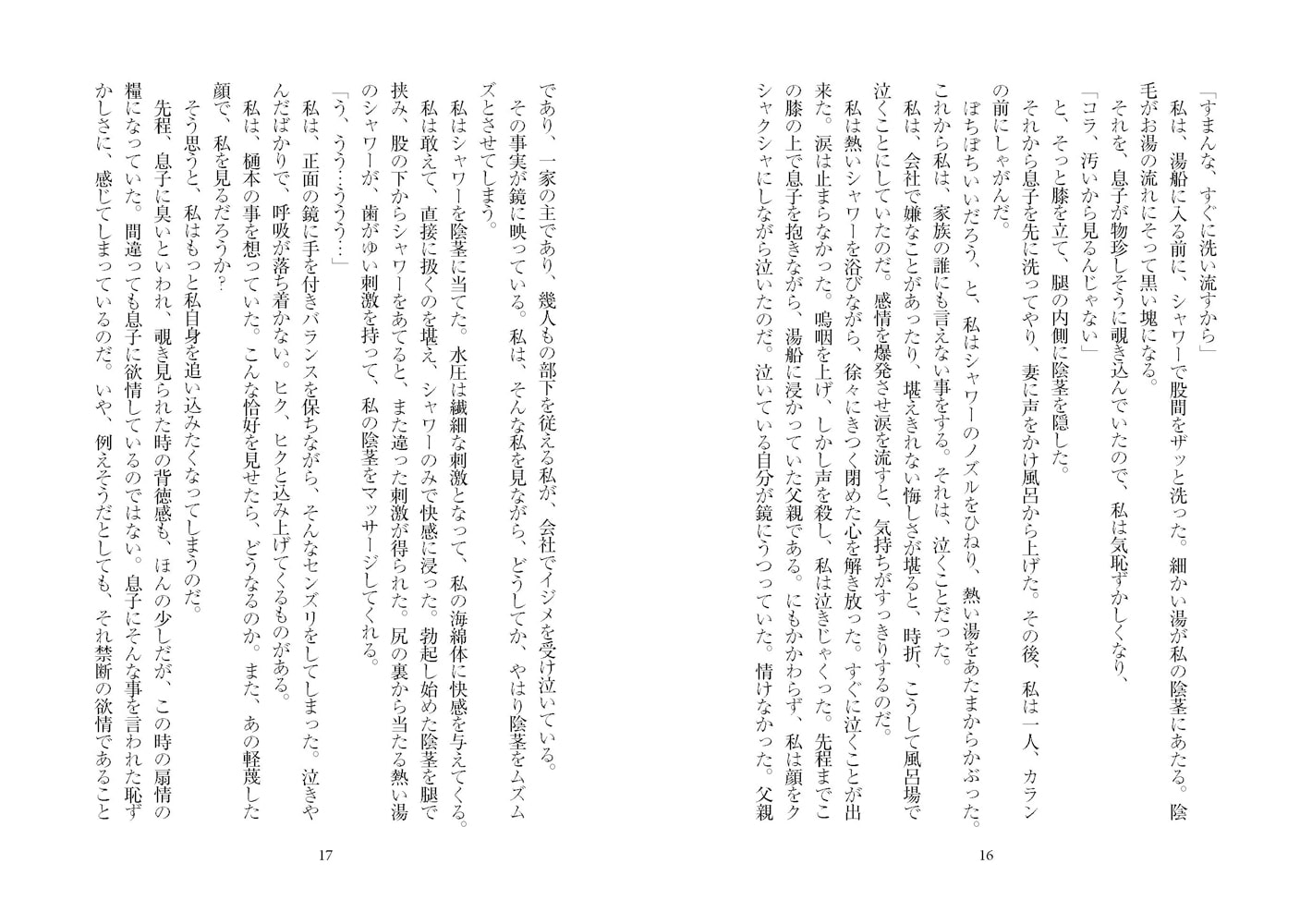 私は、立ち上がる。ベルトに手をかけ、スラックスをぬぎはじめる。(本文より)」