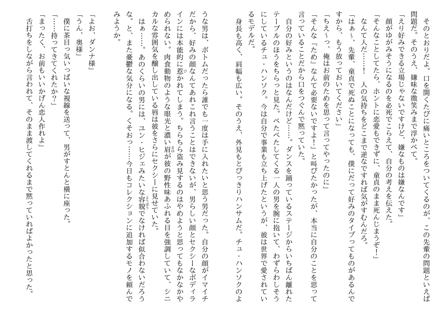 誰もが憧れるとびっきりのハンサムでスタイル抜群、デキる男の見本みたいなハンソクだが、性格はオレ様気質丸出し。