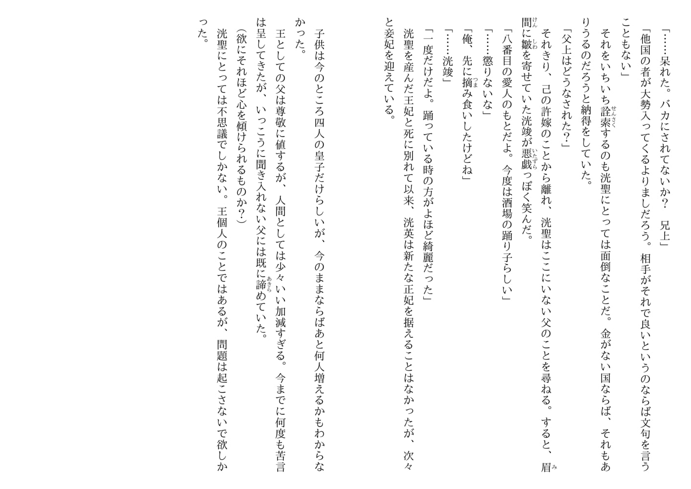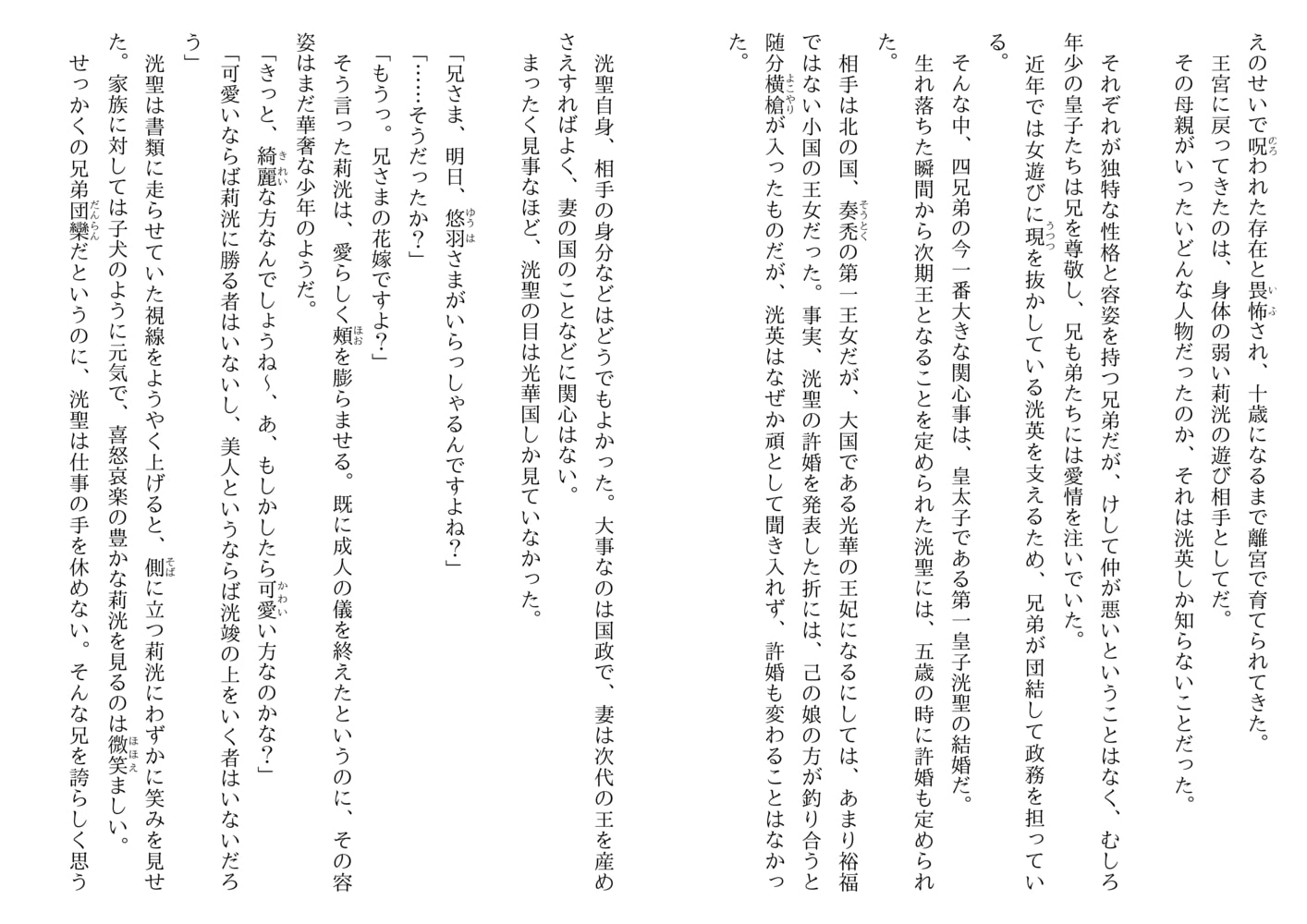 賢王として誉れ高い王には、母の違う四人の皇子、洸聖・洸竣・莉洸・洸莱がいた。