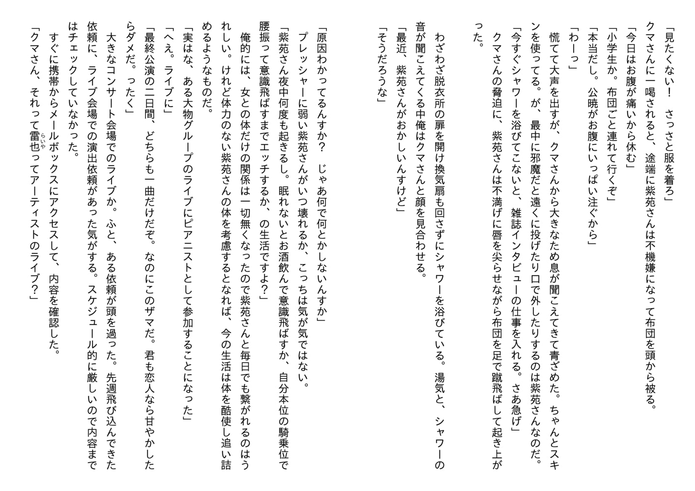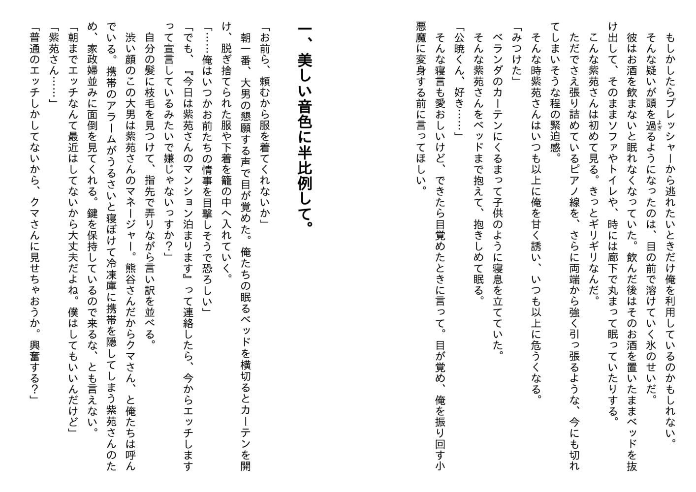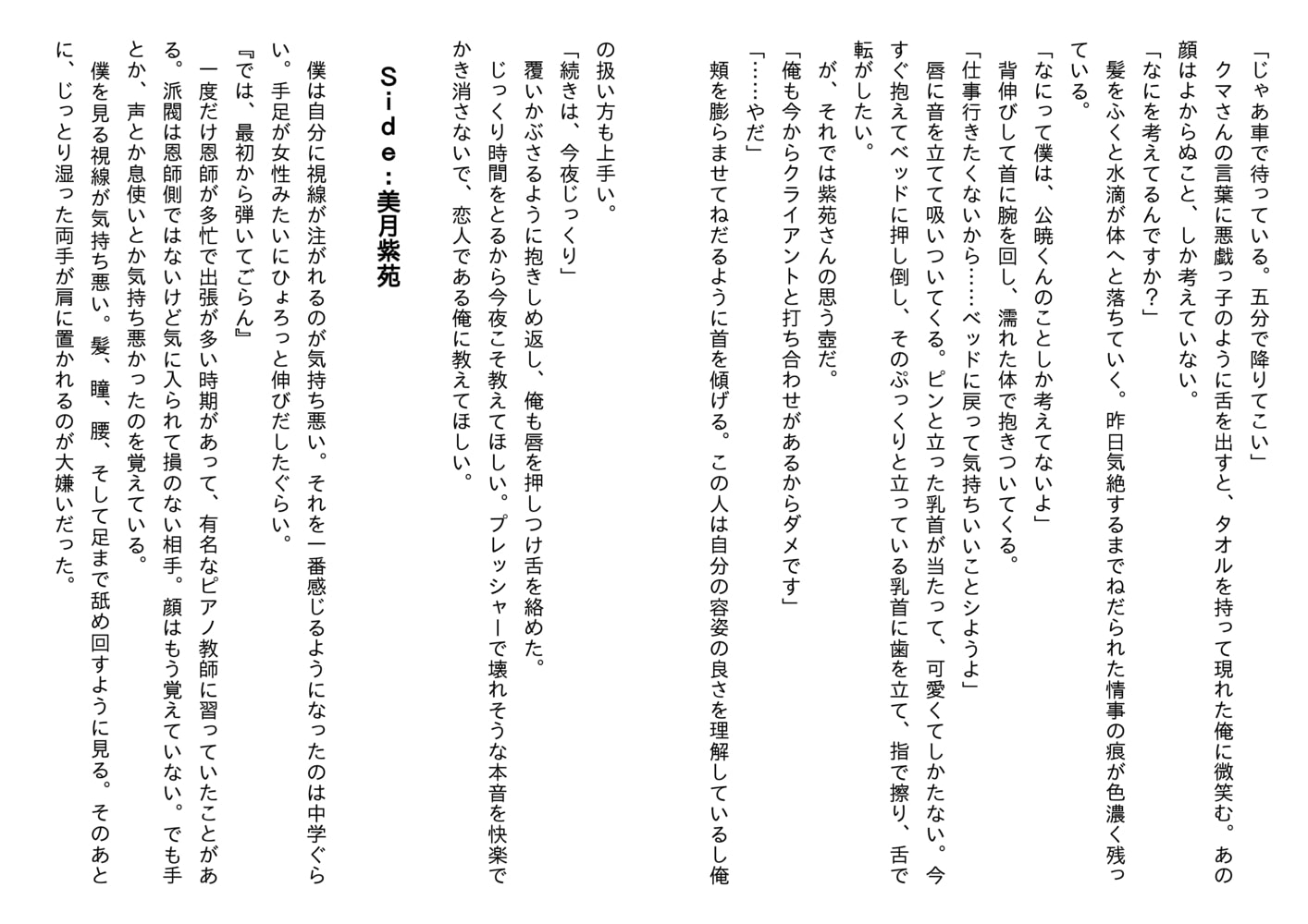 一方公暁も、体を求めるばかりで本心を見せない紫苑に不安を募らせるようになっていた。