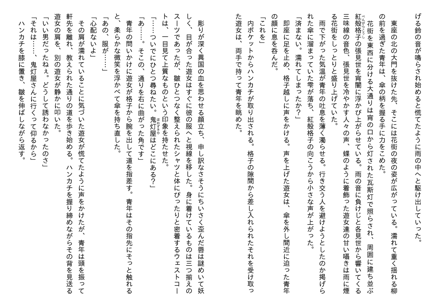 雨の日に現れた客、霧島は店一番の花魁桔梗を指名するが、桔梗は自分の名代として茅を出向かせる。