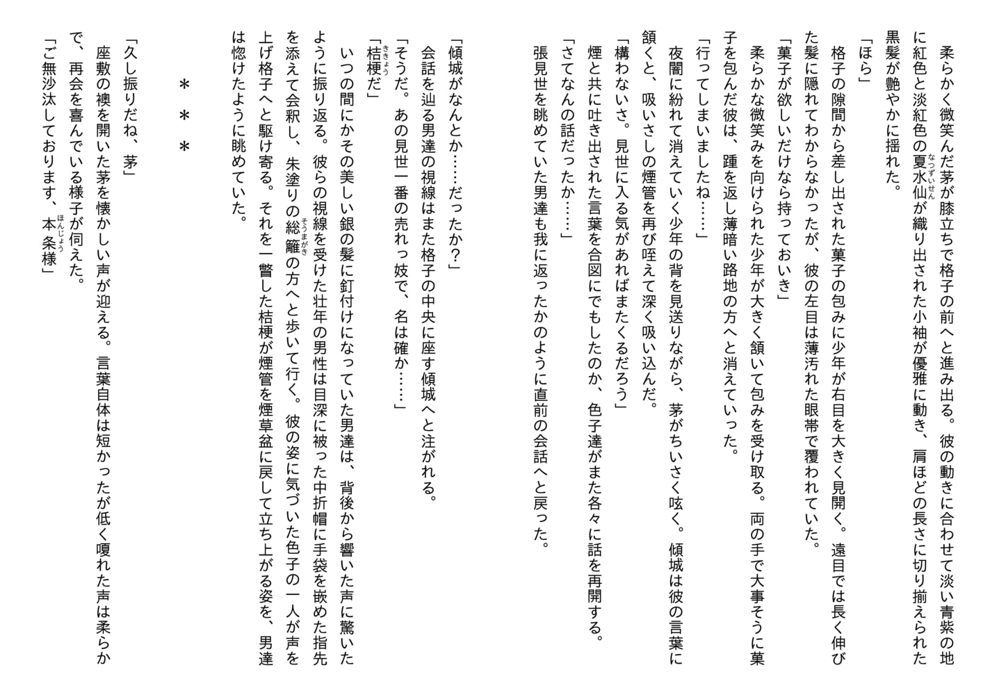 袖にされても桔梗を指名して通い続ける霧島と、その度に茅を名代として出す桔梗。
