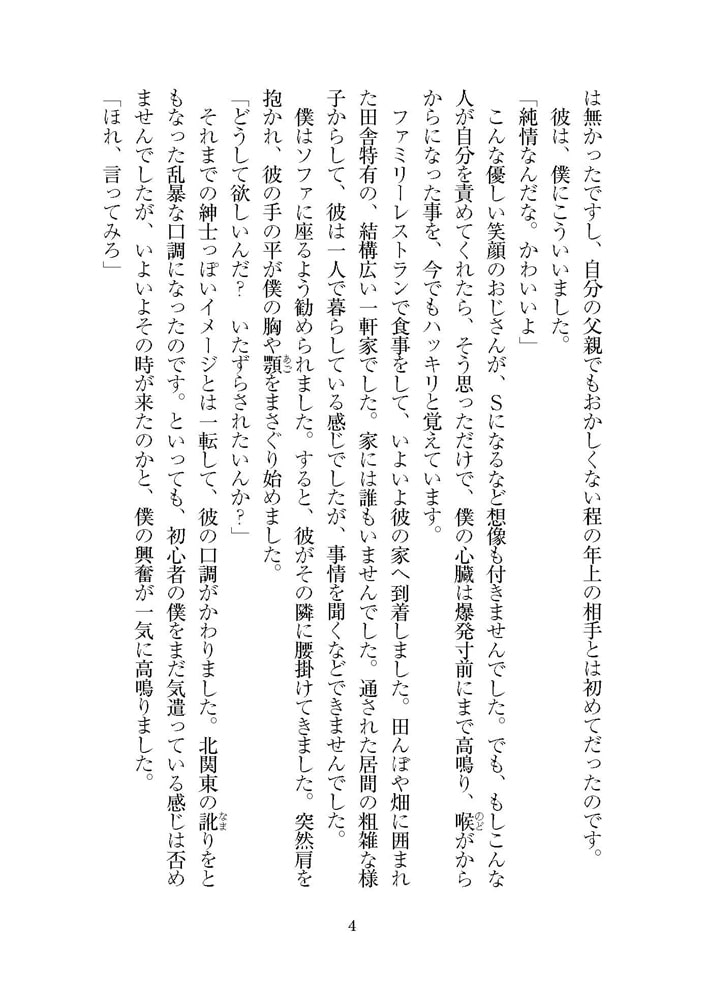 何度かの手紙や電話のやり取りで、優しそうな年上の男性と初対面を果たす。ファミレスで食事をしてから、彼の家へ招かれて…。