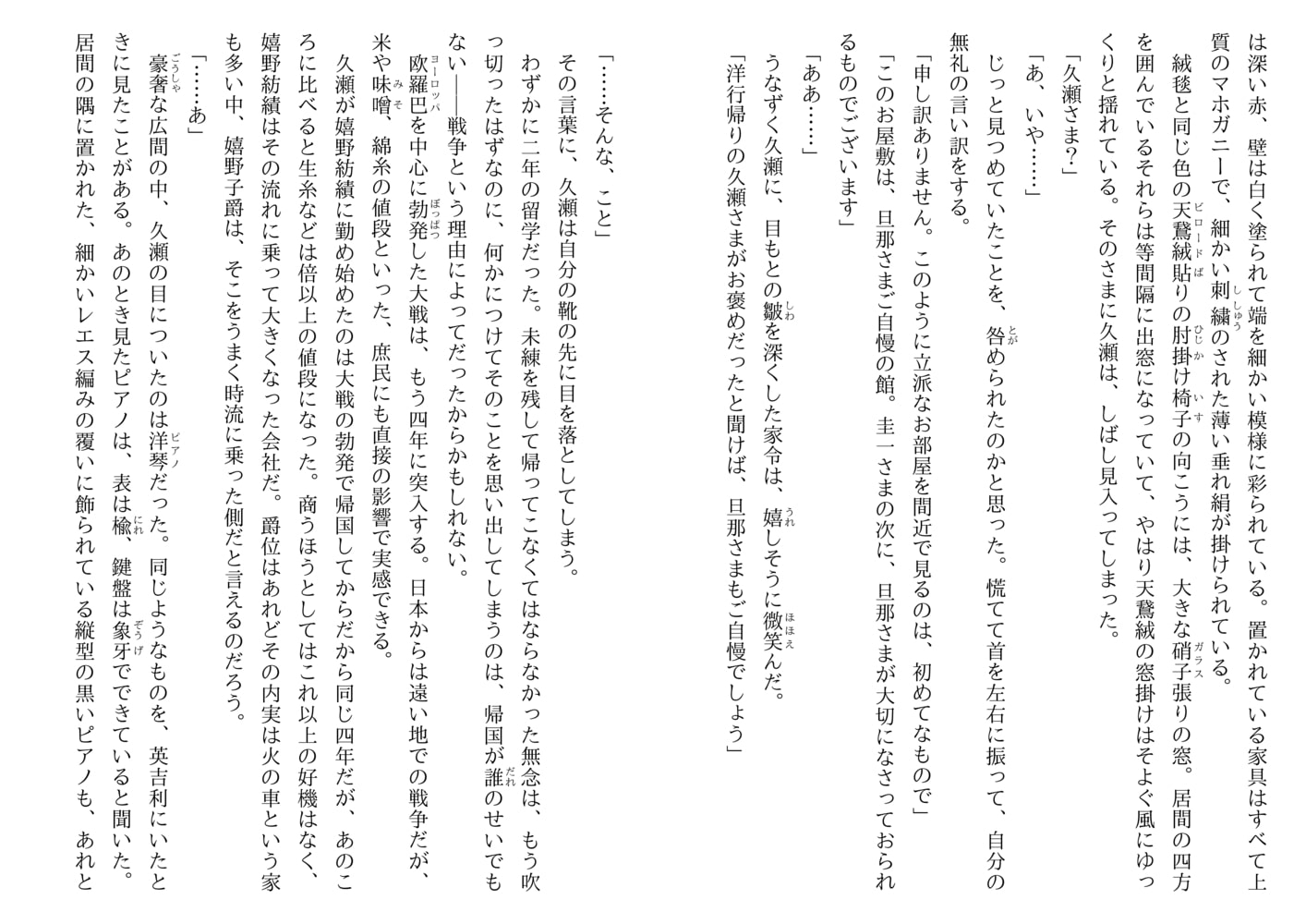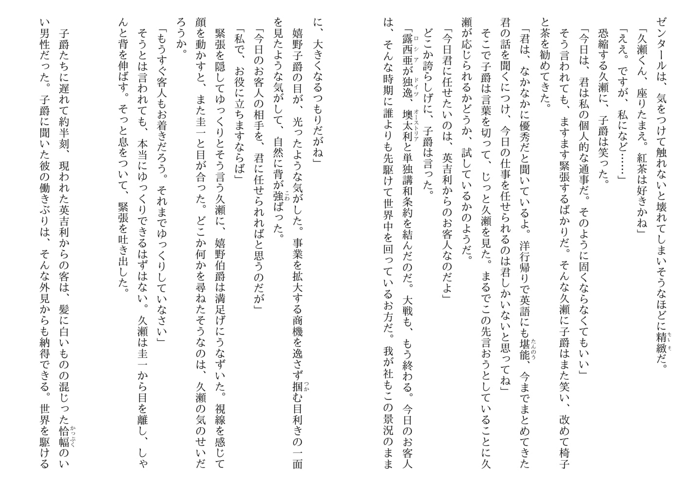大戦の景気に乗って急成長した嬉野紡績に勤める久瀬は英語の能力を買われ、