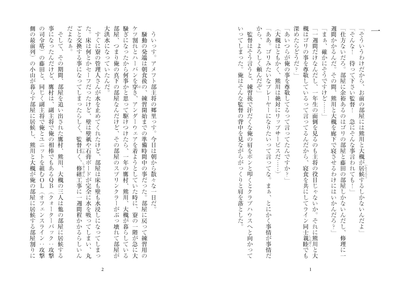 大学アメフトのオープン戦で、格下のチームに惨敗した主将の郷里は、その責任を負わされる。