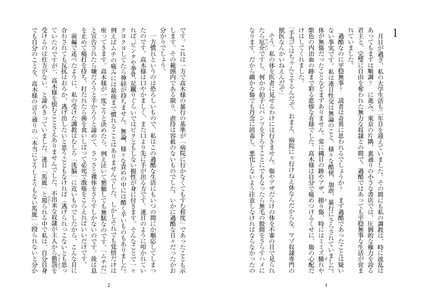 「吊りがどんなに苦しくても、許しを乞うこともできません。高木様にとって、私の裸などもう日常見慣れたものなのです。お楽しみは苦しむ姿、辛そうな表情なのですから、私は苦悶する姿を延々と御覧に入れなければなりません。『どうだ、苦しいか』『……はい』『だろうな。もっと苦しめ。まだ我慢できるな?』『……はい、御主人様』高木様は時に自分のズボンの前をさすったり、一物を取り出して軽く握ったりします。(あ、御主人様が興奮なさってる……、俺の苦しむ姿を喜んでくださってる……)そう思うと、すでにM性を本格的に開花させられた私の性器は立ち上がってしまい、高木様をいっそう楽しませたのです。(本文より)」