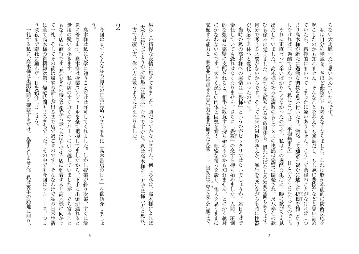 店主の数々の巧みな責めによって、完全に性奴○と化した学生。その淫らな日々が学生の口から語られる。彼の日常生活は、完全に店主によって管理されてしまっていたのである。食事、入浴、就寝…それらの全てが恐るべき苦痛と、背徳的な快感に彩られ、店主と青年の性の絆は深まり続けていく。