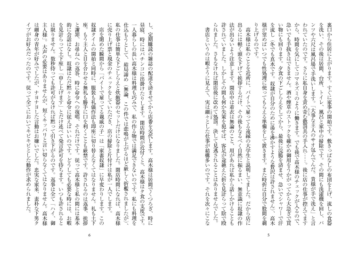 射精検査、バイブ舐め、臭い責め、飲尿調教、尻舐め調教…毎日課される徹底的な奴○飼育。しかし、店主の友人である同じ趣味嗜好を持つ、K氏が現れたことで、その日々に大きな変化が訪れて…。