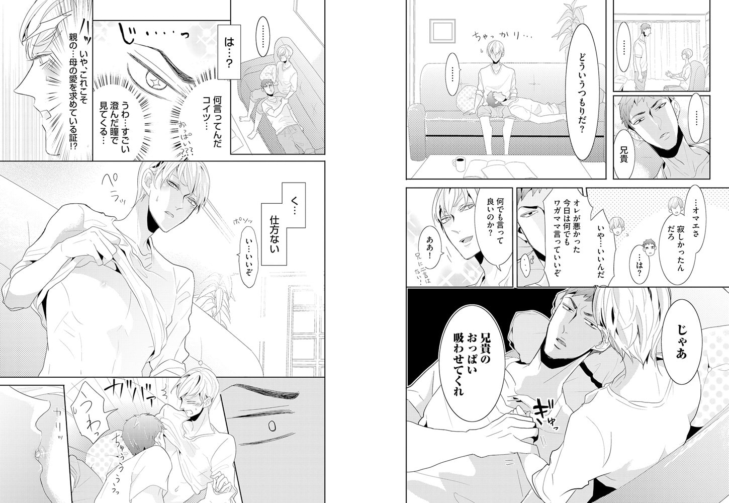 立花ビスコ『お兄ちゃん妹がいないなら、弟を食べちゃえばいいじゃない!』 かわいい妹との甘い生活を夢見るDKの剛。しかし現実は、自分よりガタイのいい義弟・理央からストーカーのようにつきまとわれる毎日。自分の愛情が足りないから理央が寂しがっていると思った剛は、思いっきり甘えさせてみることにするのだが…!?