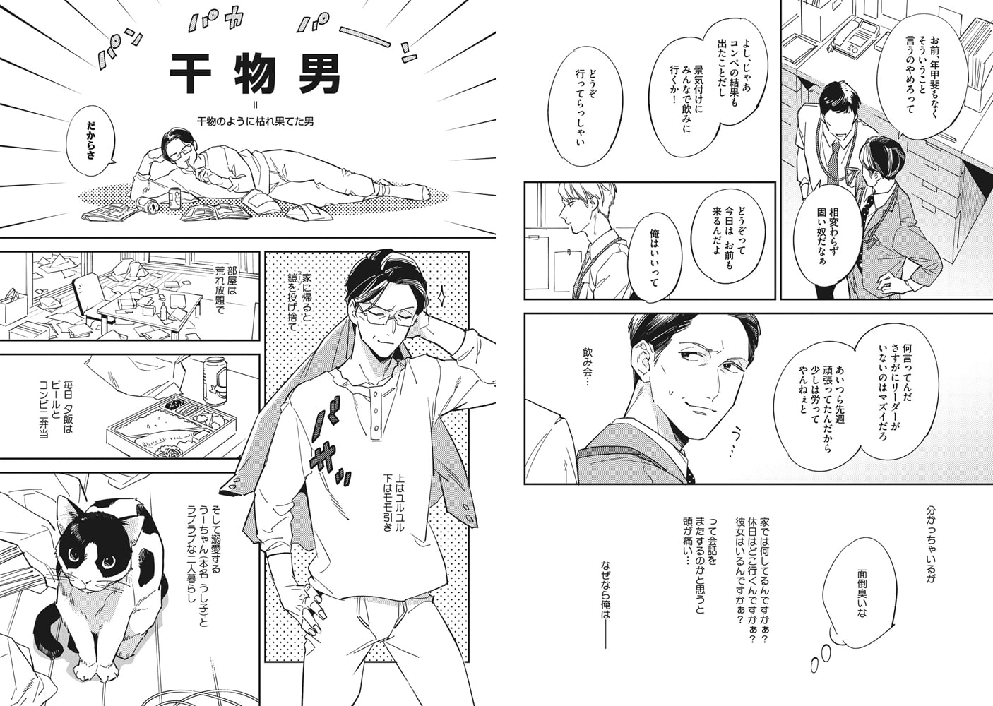 デキる男と名高い木村には誰にも言えない秘密があった。それは干物のように枯れ果てた男――通称・干物男だということ!! ヨレヨレシャツに股引をこよなく愛し、汚部屋でビール片手に愛猫とたわむれる日々。ところが生意気な部下・西口とホテルで一夜を過ごしたことで平穏な干物ライフに終止符が打たれる…のか!?