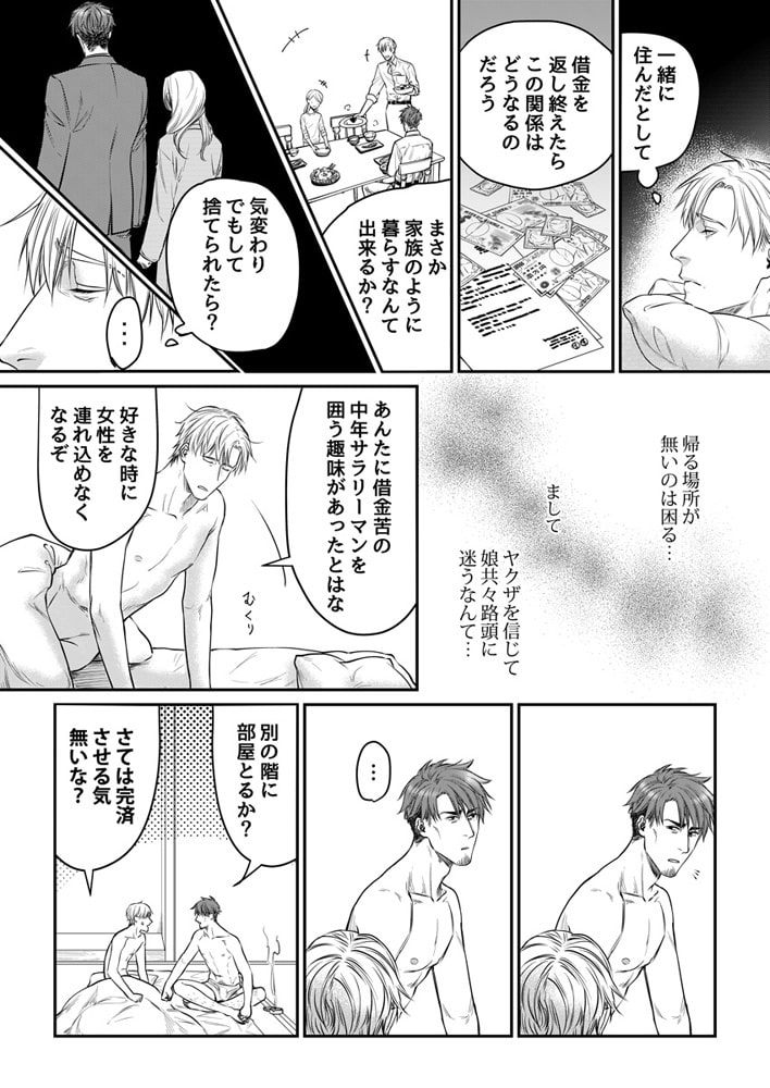 その男の前に突如降って湧いたのは“ヤクザ”だった――。不幸により妻を亡くした、平凡な会社員の園田(そのだ)。葬儀から帰ってくるとインターホンが鳴り、現れたのはヤクザ風の男。金融会社を自称するその男に、妻が多額の借金をしていたことを知らされる。すぐに支払えるような額ではなく狼狽える園田に、ヤクザが提案してきたのは驚くべき内容だった。「俺が、あんたを買ってやるよ」――その日から頻繁に家に押し掛けては体を求めてくるヤクザ。見た目とは裏腹に優しく触れる手つきに園田は…?