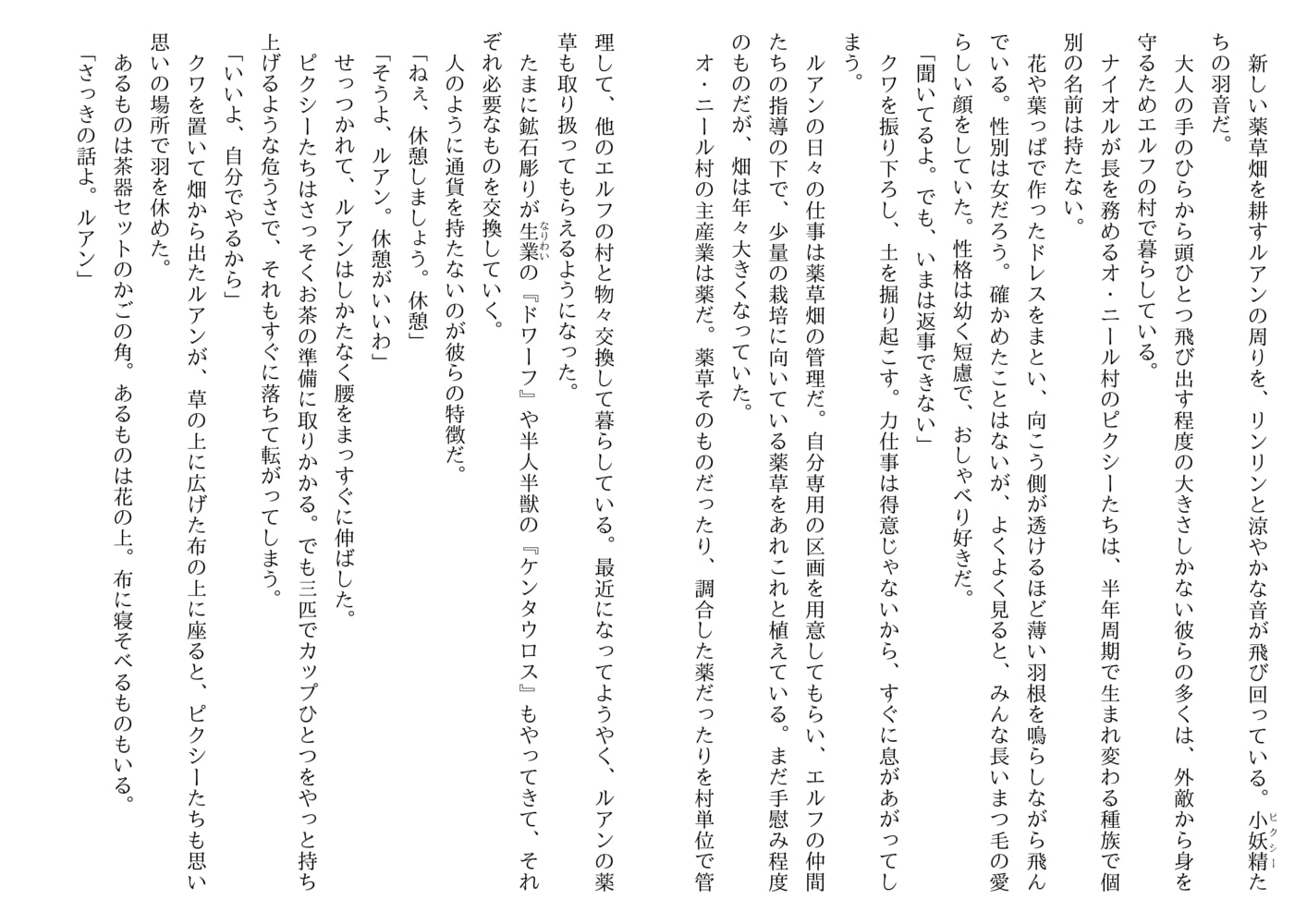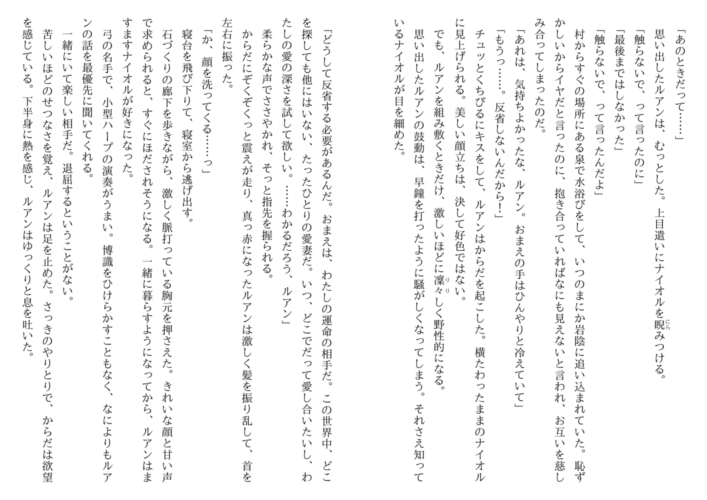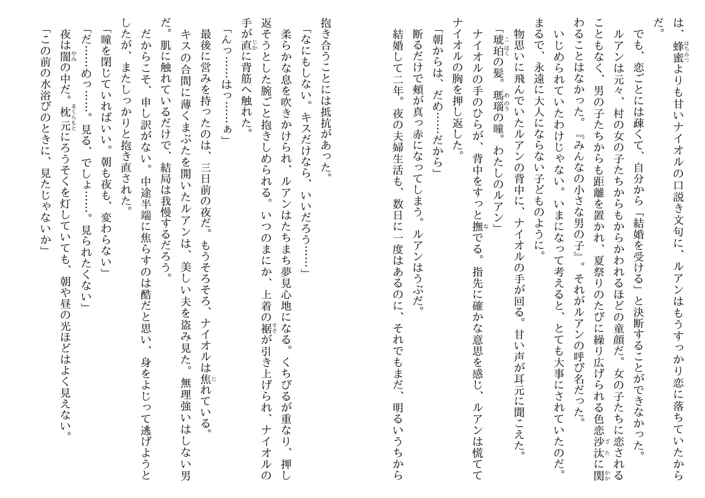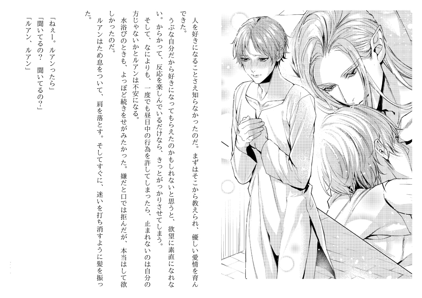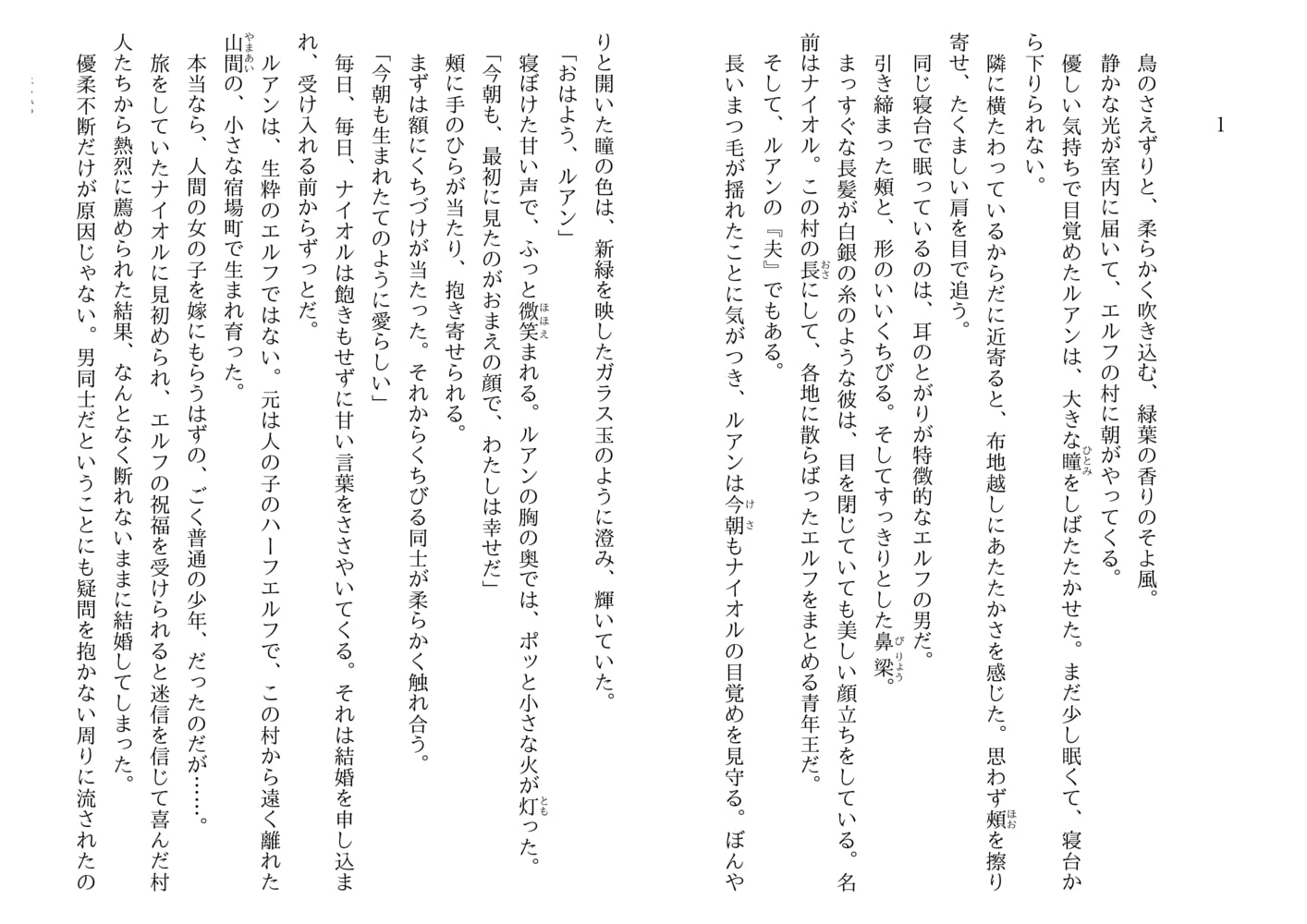 恋に疎いごく普通の青年ルアンは、運命の伴侶を探していたエルフの王、ナイオルに見初められ求婚された。そうして二年。これまでにないほどの快楽に満ちた一夜が明け、ふたりは待望の赤ん坊を授かった。火の精霊の加護のもとに生まれた子、エイダン。だが夜泣きが酷く成長もおもわしくない。自分がエルフではないから…と思い悩むルアン。ある晩、ナイオルの留守に現れたゴブリンに、エイダンは獲物の印をつけられてしまい…。