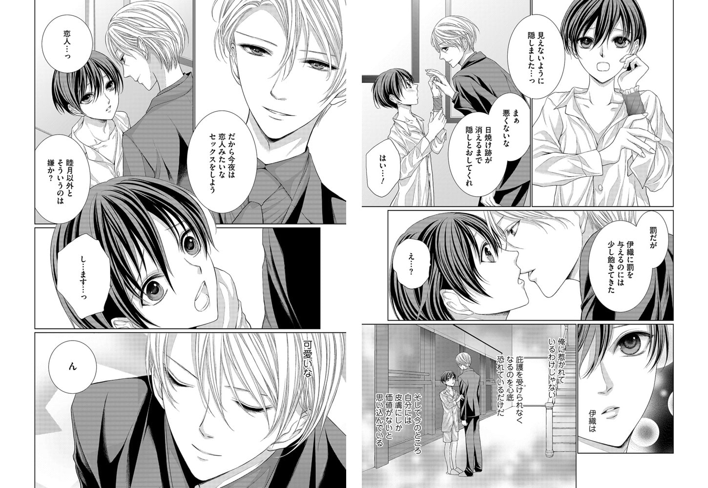 睦月と外で過ごして、うっかり肌を日焼けしてしまった伊織。睦月は、伊織の皮膚の所有者である椿に「自分のせいだから!」と伊織をかばって叱られる。納得できない伊織は椿に「自分にも罰を与えて欲しい」と願い出る。そして椿の罰は「恋人のようなセックス」をする…という罰で、普段屈服させられるセックスとの違いに恥ずかしさがこみ上げてきてしまい…。