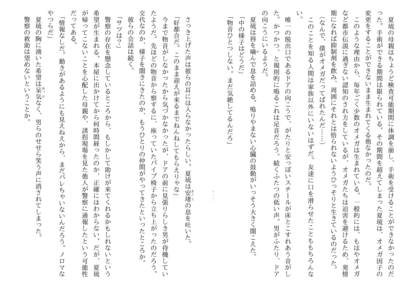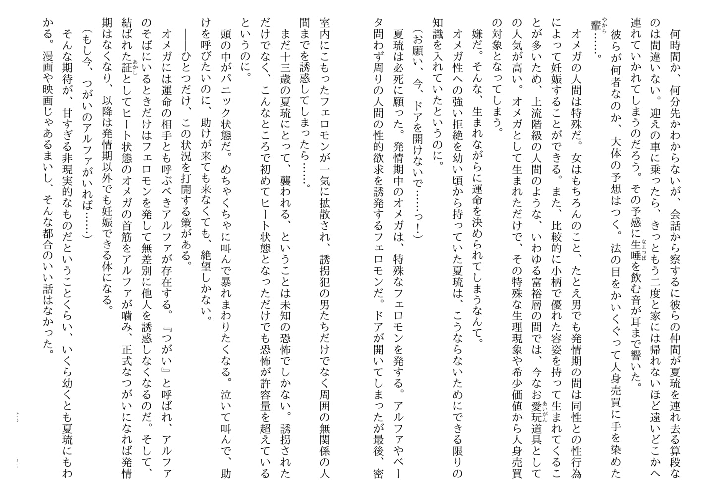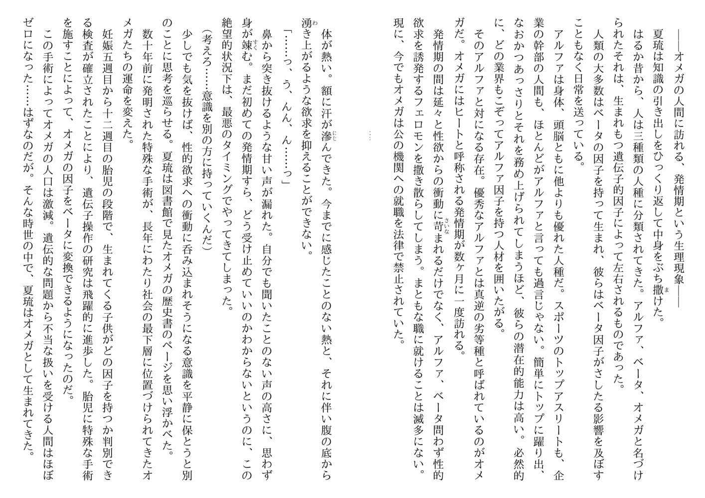 はるか昔より人間の運命を分けてきた三つの因子――アルファ、ベータ、オメガ。ベータへの変換手術が普及し激減したオメガだったが、その稀少価値ゆえに逆に人身売買が多発。警察は闇の犯罪組織撲滅のため専門の部署、通称GF機関を立ち上げた。警官学校をトップの成績で卒業した新米警官の夏琉はそのGF機関に配属され、検挙率ナンバーワンを誇るエリートアルファ刑事・唐立の下につくことになった。実は夏琉は公的職種に就くことが禁止されているオメガ。かつて集団拉致事件に巻き込まれた折、当時新人だった唐立に助けられ、以来彼への憧れを捨てきれずオメガであることを隠して警察官の道へ進んだのだ。あれから7年を経た今、精悍さと冷徹さの増した唐立とともに早速極秘の捜査に向かう夏琉。危険な綱渡りの日々の中、ついに予想外の発情期という絶体絶命の事態が…。