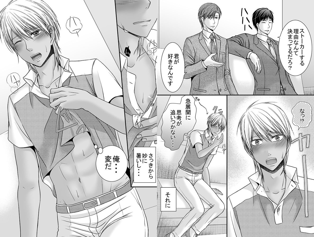 俺はとある会社で清掃のアルバイトをしている大学生。その会社では社長さんも秘書さんも優しく声をかけてくれて、アルバイト環境は良好。だけど俺には最近悩みがある。それは、ストーカーにあっているような気がすること。バイトの後そのことについて、社長の南川さんと秘書の久木さんに相談したら、実はストーカーの正体は南川さんと久木さんだった。だって君の事が好きだからとあっさり認めて、告白されて混乱する俺。さらにはどちらがいいか選んでくれと2人で迫ってきた!出されたケーキに媚薬が仕込まれていたみたいで、身体が言うことをきかない。気が付けばなすがままにソファに押し倒されて、服を脱がされ、2人から体中を舐めらまっくって、乳首責めと手コキでイカされる!優柔不断な俺に対し2人は、カラダの相性のいいほうを選べばいいと言い、口とお尻の両方から愛されて、激しすぎる3Pの快楽にもぅ何も考えられない…!ウブなノンケ大学生が、余裕たっぷりの大人な男たちに徐々に体を開発され、快楽に抗えずエッチに悶える姿をご覧になりたい方におすすめです。