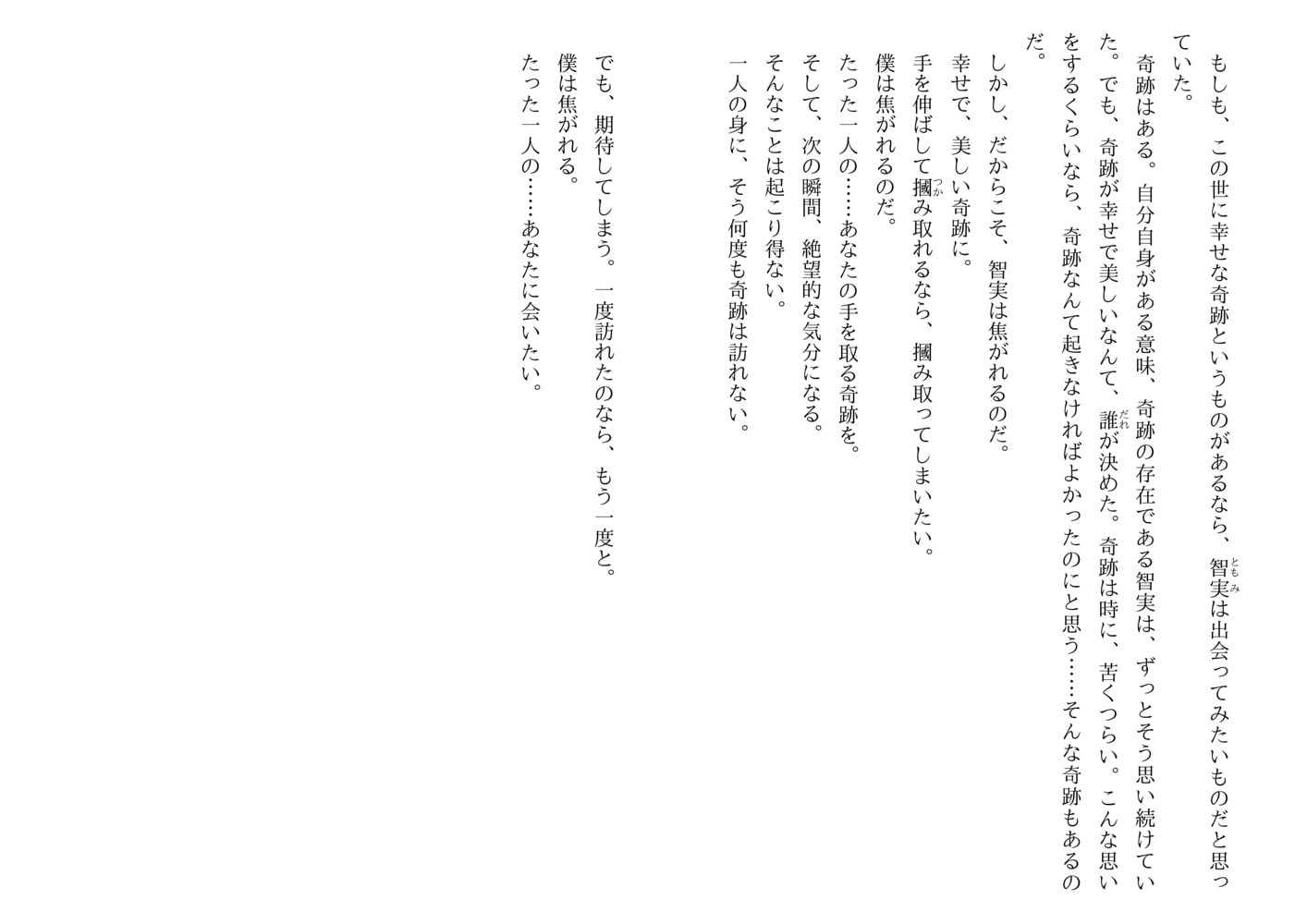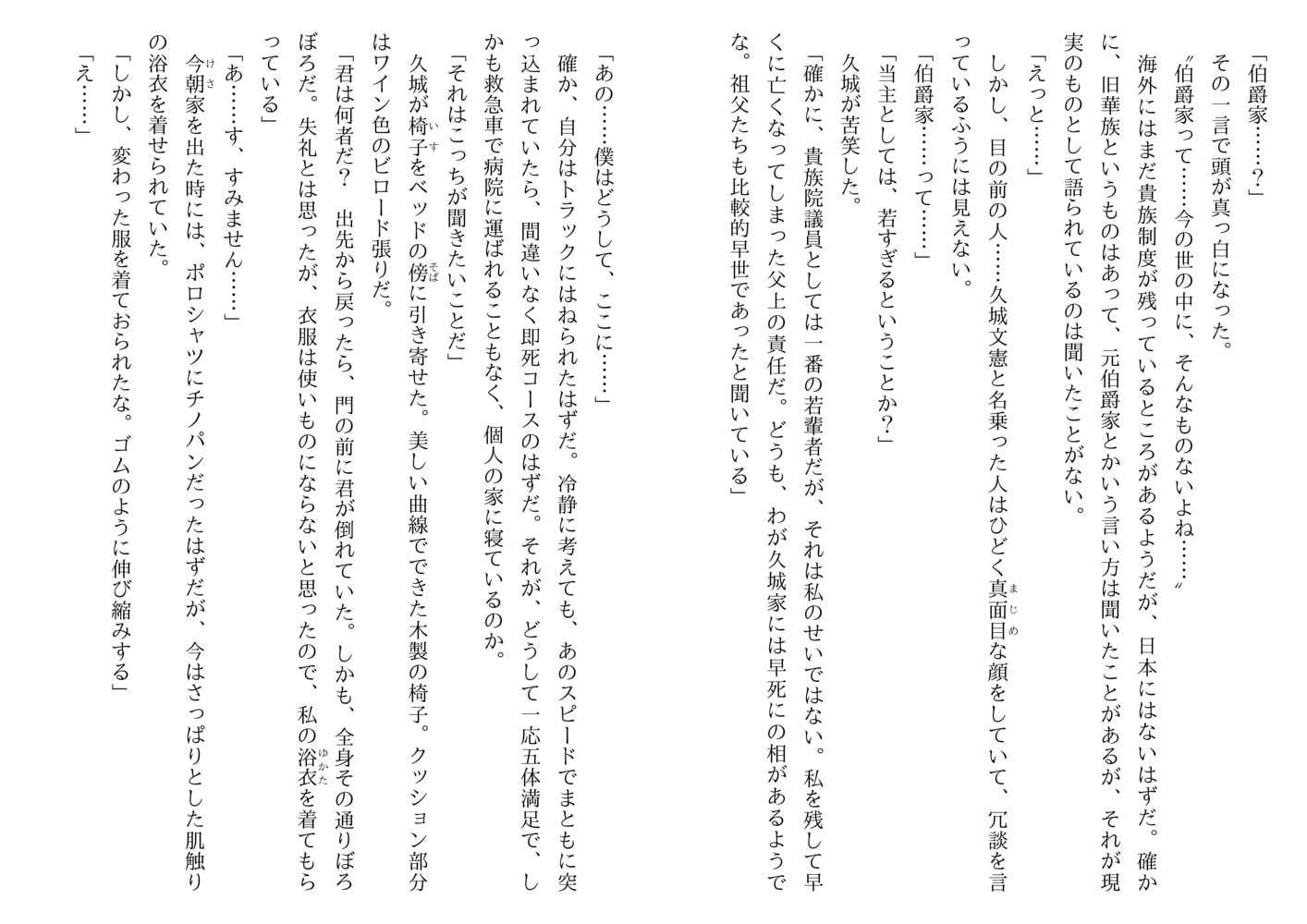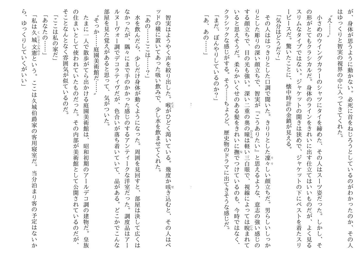 出勤途上で事故に遭い、目覚めるとそこは伯爵家の客用寝室――医師の桂木智実は大正時代にタイムスリップしてしまった。若き当主、久城文憲はそんな智実を受け入れ、一緒に暮らす七歳の甥、伸吾の家庭教師という仕事まで与えてくれた。ある特殊な『力』を持っているがゆえにずっと孤立し生き方に悩んでいた智実。貴族院議員の久城もまた時代の風に向かい一人で闘っていて…。百年の時を超え二つの魂が寄り添うレトロロマンス。