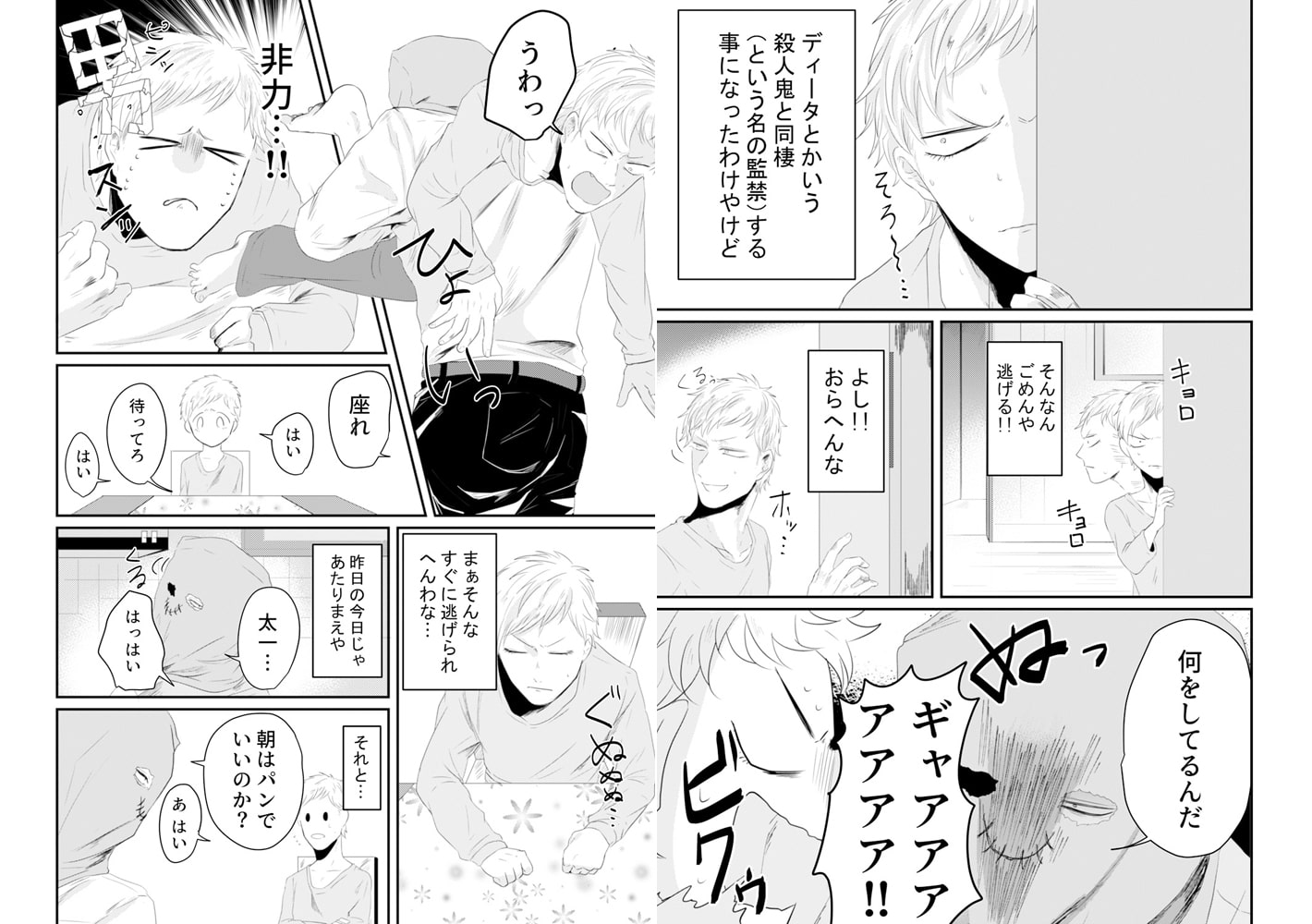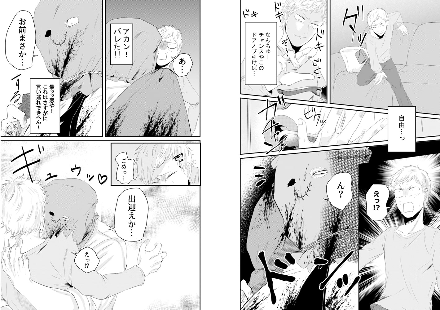 覆面殺人鬼に監禁されて処女を奪われました。─気が付くと知らない部屋で手足を縛られ監禁されていた太一。一人キャンプで殺人現場を見てしまい、殺人鬼に拘束されたらしい。俺の人生ここで終わりか…と思ったら耳を舐められた!なんやねん!かと思えば正面に椅子を置いて静かに見つめ始めた!ホンマになんやねん!!拘束を解かれたと思えば「惚れた」!?俺も殺しの対象ちゃうんかーーーい!!!!何とか逃げ出そうと自分も惚れたと嘘を吐いたら、いきなりデカすぎるアレを突っ込まれて!?慣らされていないせいで痛いはずなのに、どんどん気持ちよくなってきて…「声…抑えるな」アカン…はよ…イって…っ!覆面殺人鬼と関西人の歪な同居生活が今始まる!!