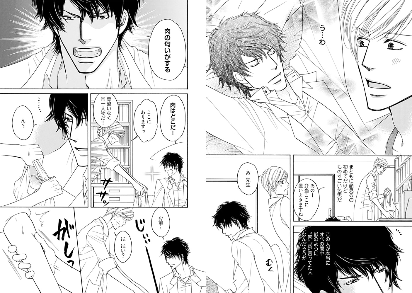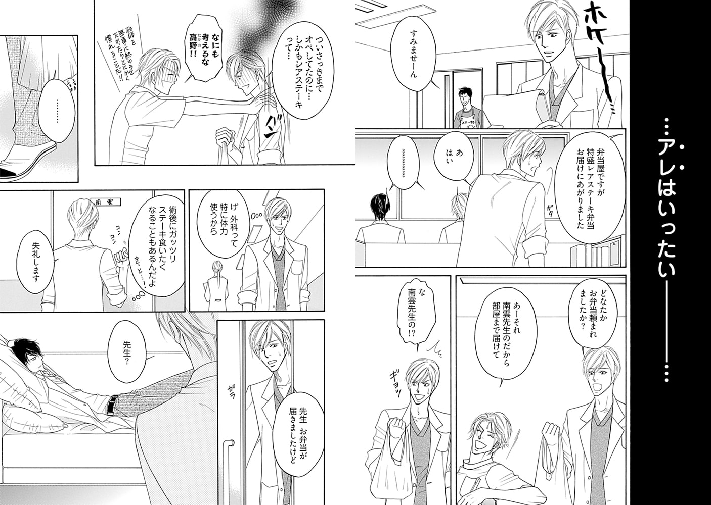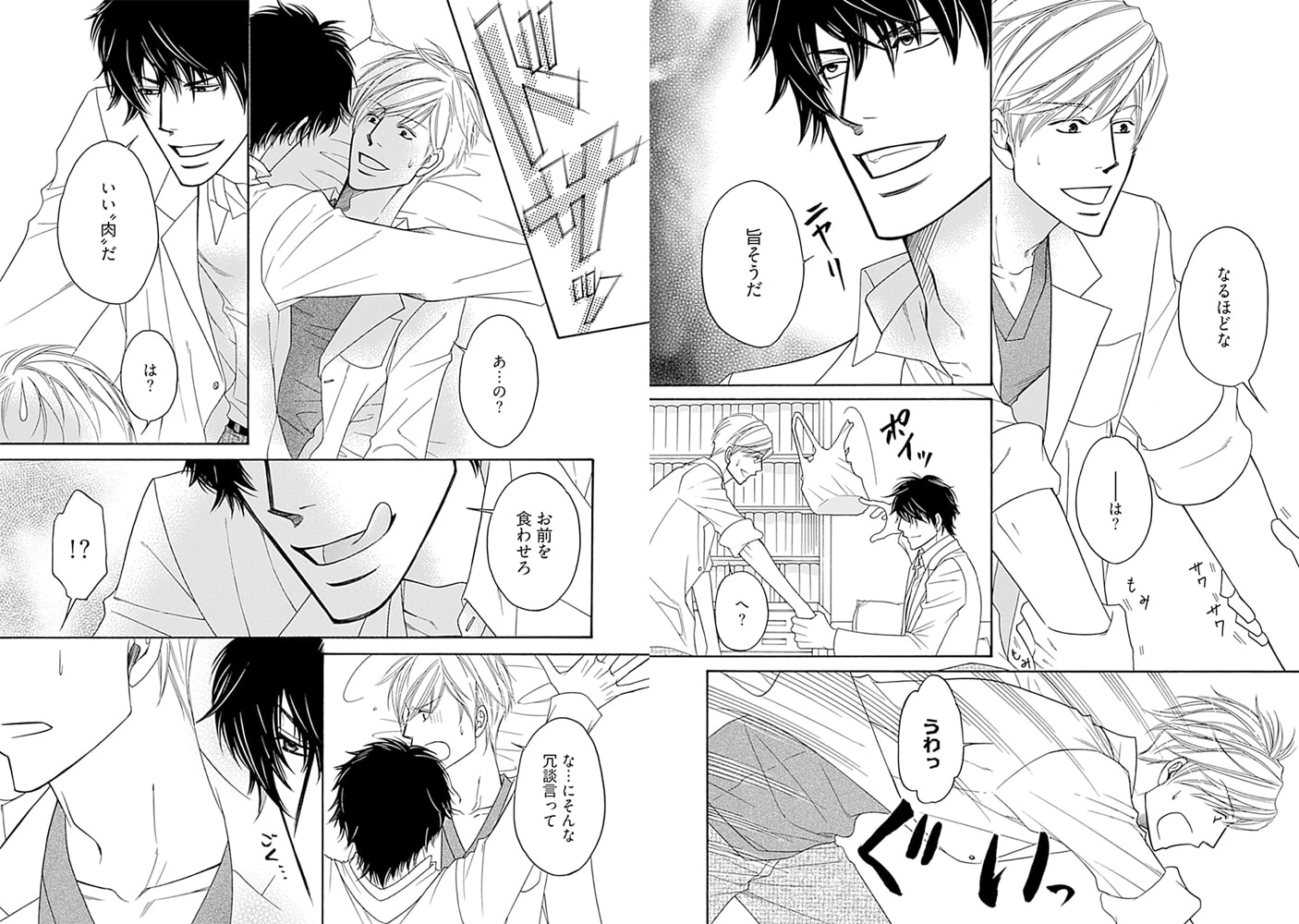 天才外科医の南雲は異常なほどの肉好きで、肉を扱う(?)執刀後はいつも超興奮状態。 そんな南雲から『最高に旨い肉』と目をつけられた研修医の高野は、あれよあれよという間に美味しくいただかれてしまうv 生真面目な高野にとって、憧れの南雲の変態ぶりはかなりのダメージ……のハズが、自分(肉)への猛烈執心ぶりにうっかり惑わされて!? 限りなく変質者な肉食外科医とウブな御馳走男子の、イキすぎ院内ラブダイアリーv